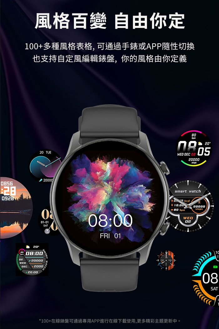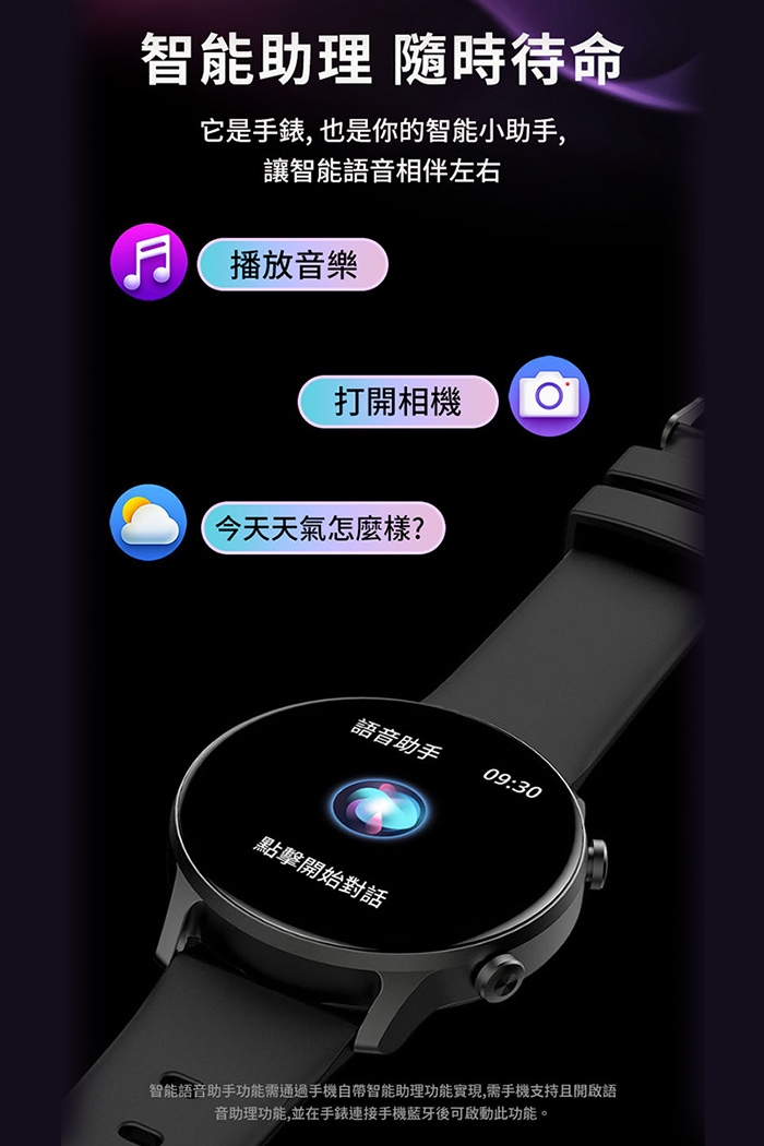 其他功能:藍芽通話、語音助手、2套主題風格、2款小遊戲、時鐘/日期願示、多錶盤、OTA升級、來電拒接、音樂控制、播放音樂、來電提醒、短信通知、應用推送提醒、鬧鐘提醒、久坐提醒、喝水提醒、低電量提醒、天氣預報、秒表、手電简、計時器、恢復出廠設置、固件信息、尋找手機、勿擾模式、抬腕亮屏、亮度調節。