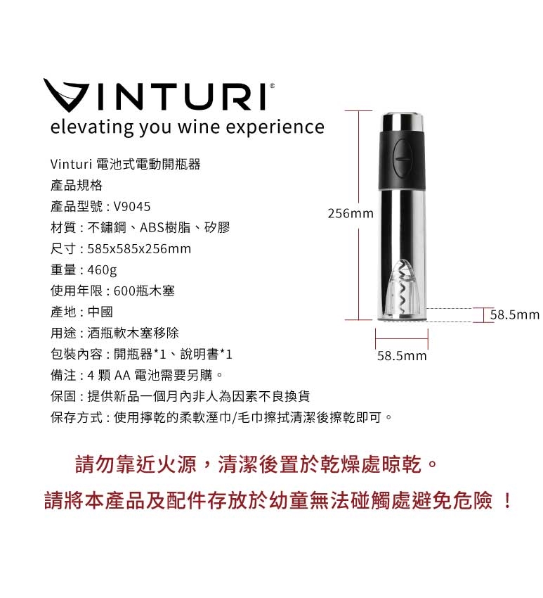 請勿觸碰或調整開瓶器的內部機構或螺絲,以防止人身傷害和或產品損壞。