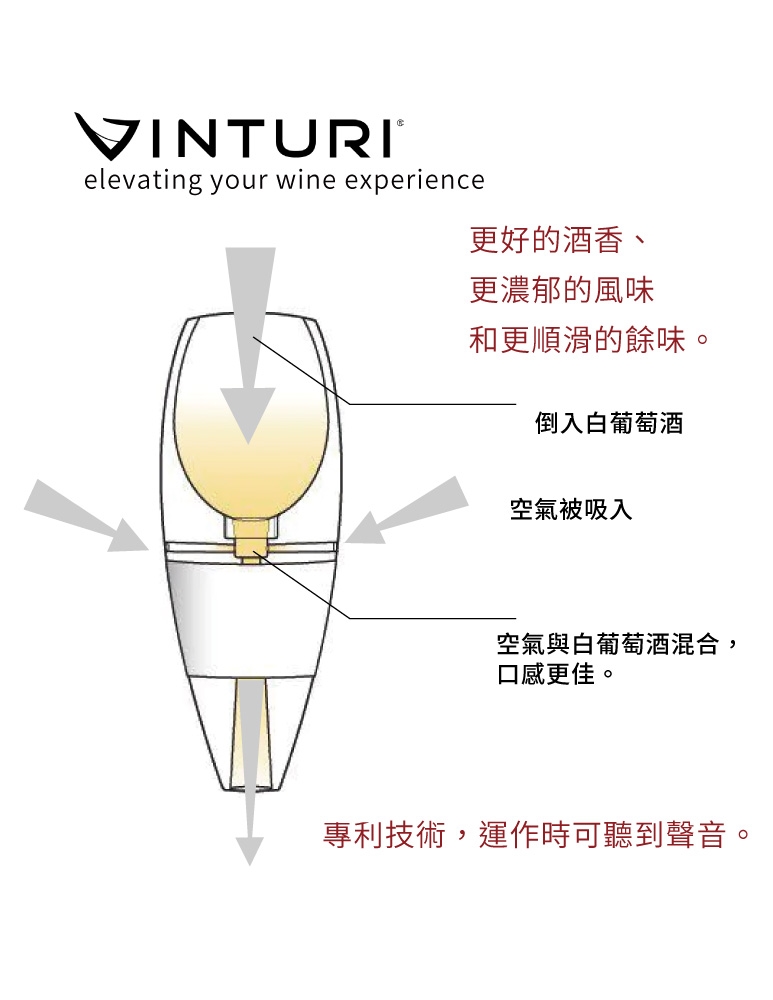 l 給白葡萄酒醒酒時,會有Vinturi醒酒器獨一無二的聲音,讓您知道您擁有一個正宗的Vinturi醒酒器,並非山寨仿製品。
