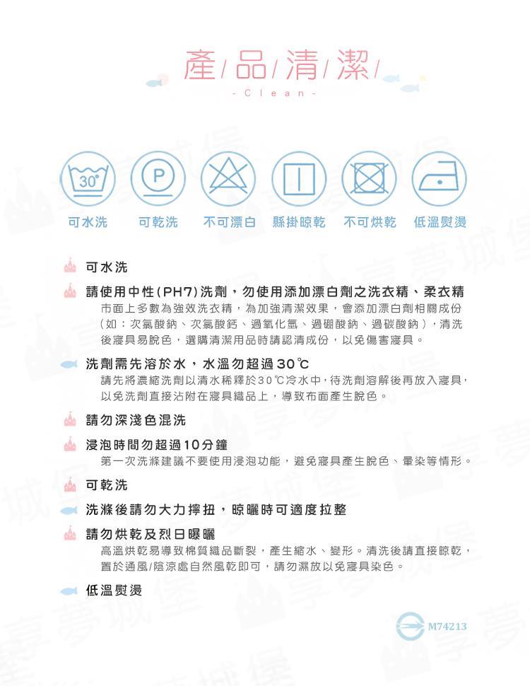 .建議清洗方式:將水置入洗衣機倒入中性清潔劑,再放入寢具商品,以弱速水洗與弱速脫水,自然風乾即可。