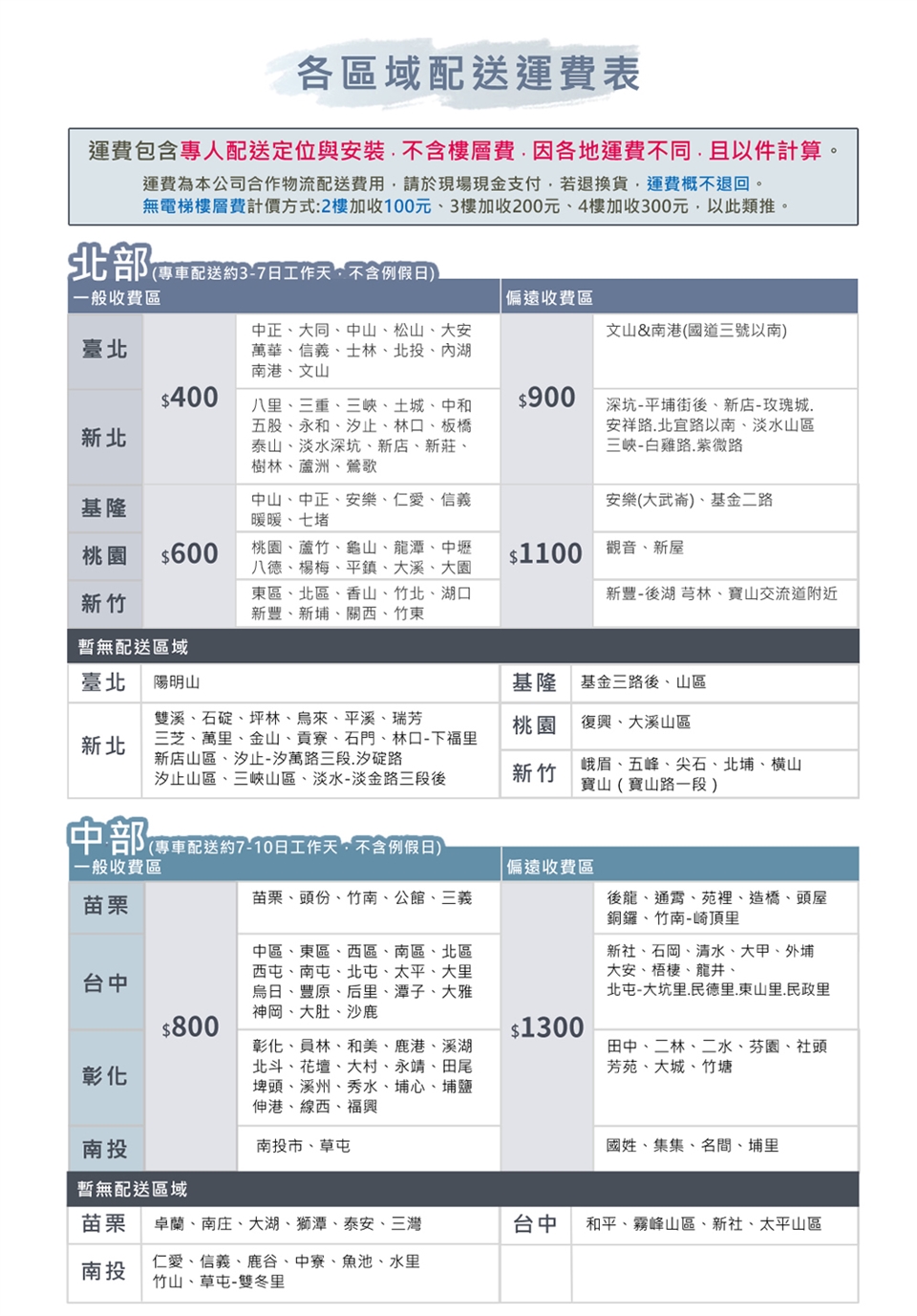 ◆勞務運送費依照地區以件計費,由物流人員現場收費,請詳閱運費表圖文說明。