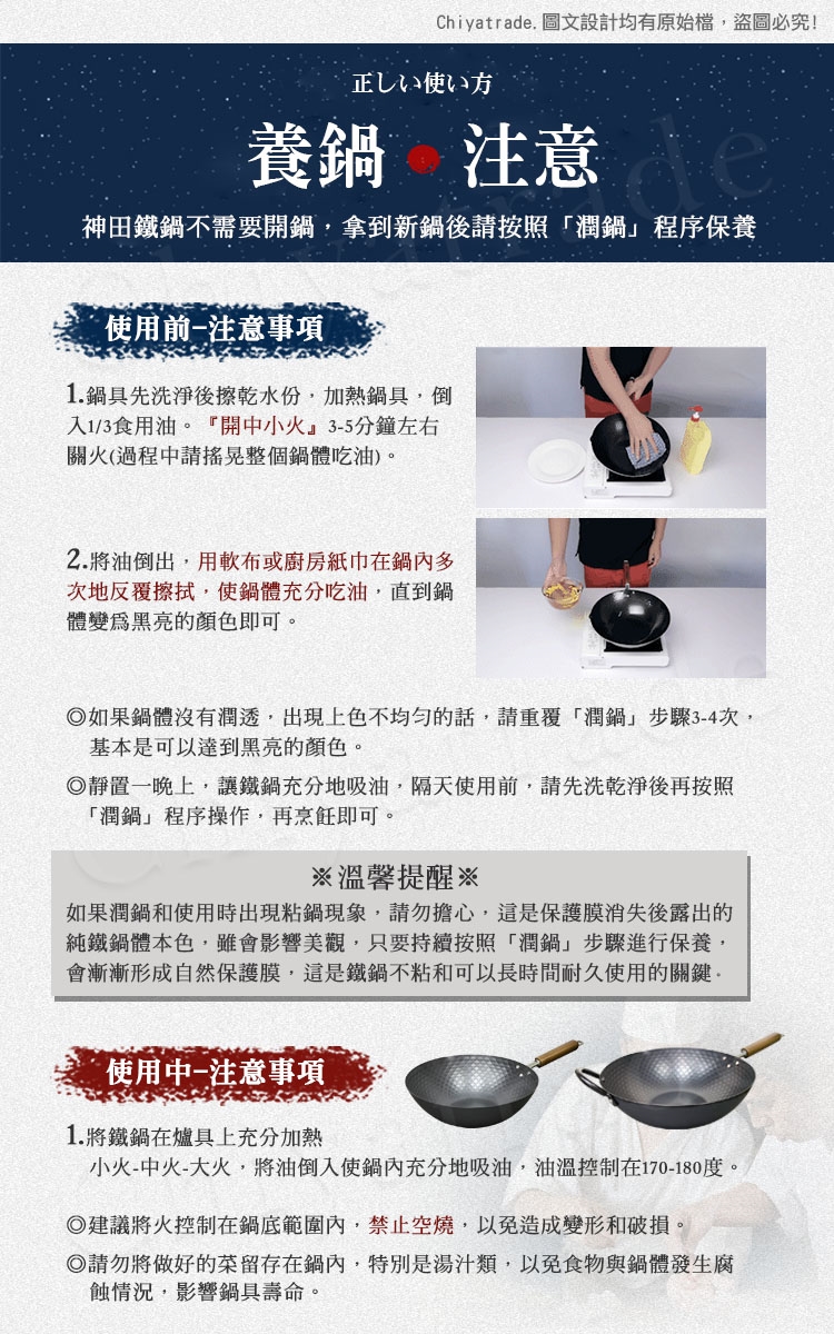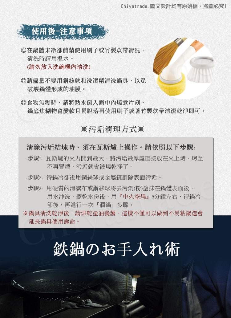 (只要持續按照「養鍋」步驟進行保養,會漸漸形成自然保護膜,這是鐵鍋不粘和可以長時間耐久使用的關鍵。)