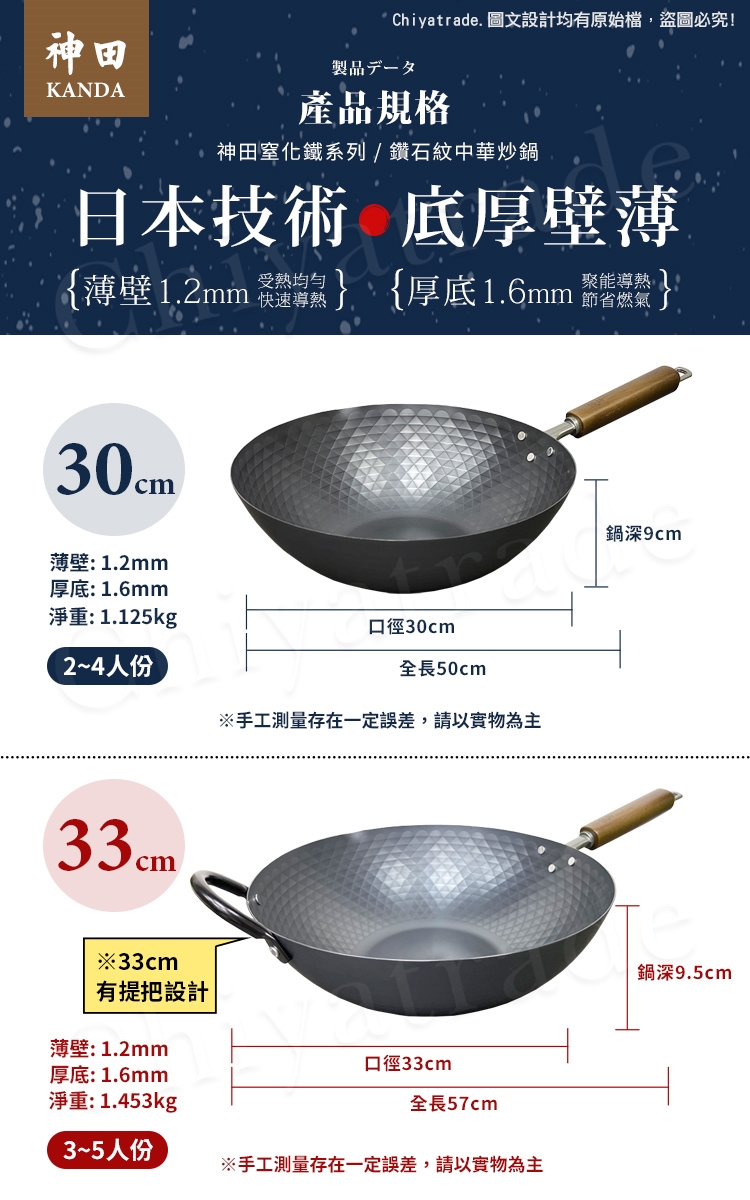 -尺寸:鍋內直徑33cm,總高9.5cm,總長57cm,薄壁1.2mm厚底1.6mm(手量誤差±3%)