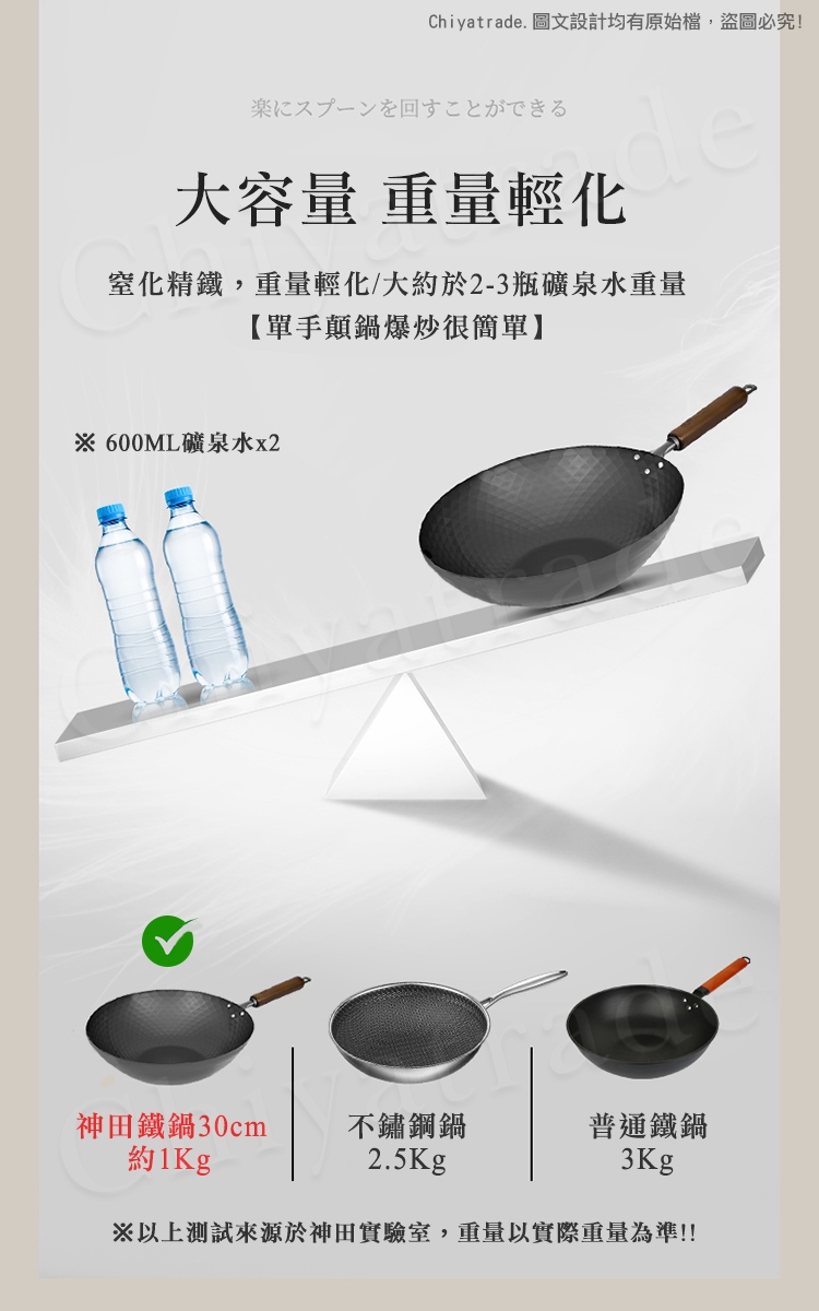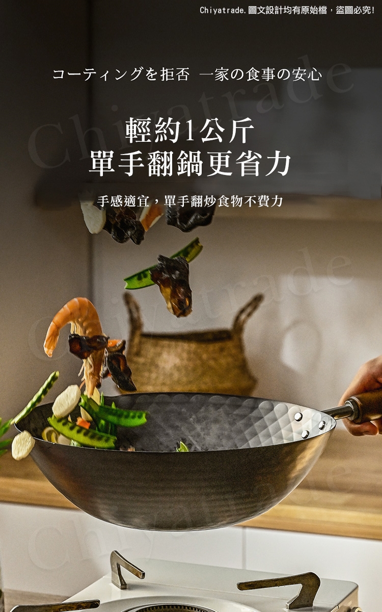 約2-3瓶礦泉水重量,較沒有一般市售鐵鍋的笨重感,顛炒輕鬆,快速出菜
