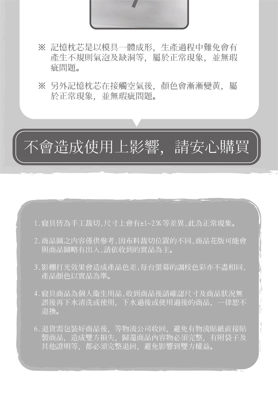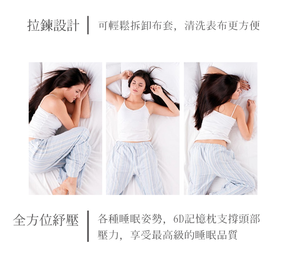 記憶枕芯:不可水洗/不可乾洗/不可烘乾/不可漂白/不可熨燙/不可烈日曝曬/請外加枕套使用以延長使用壽命
