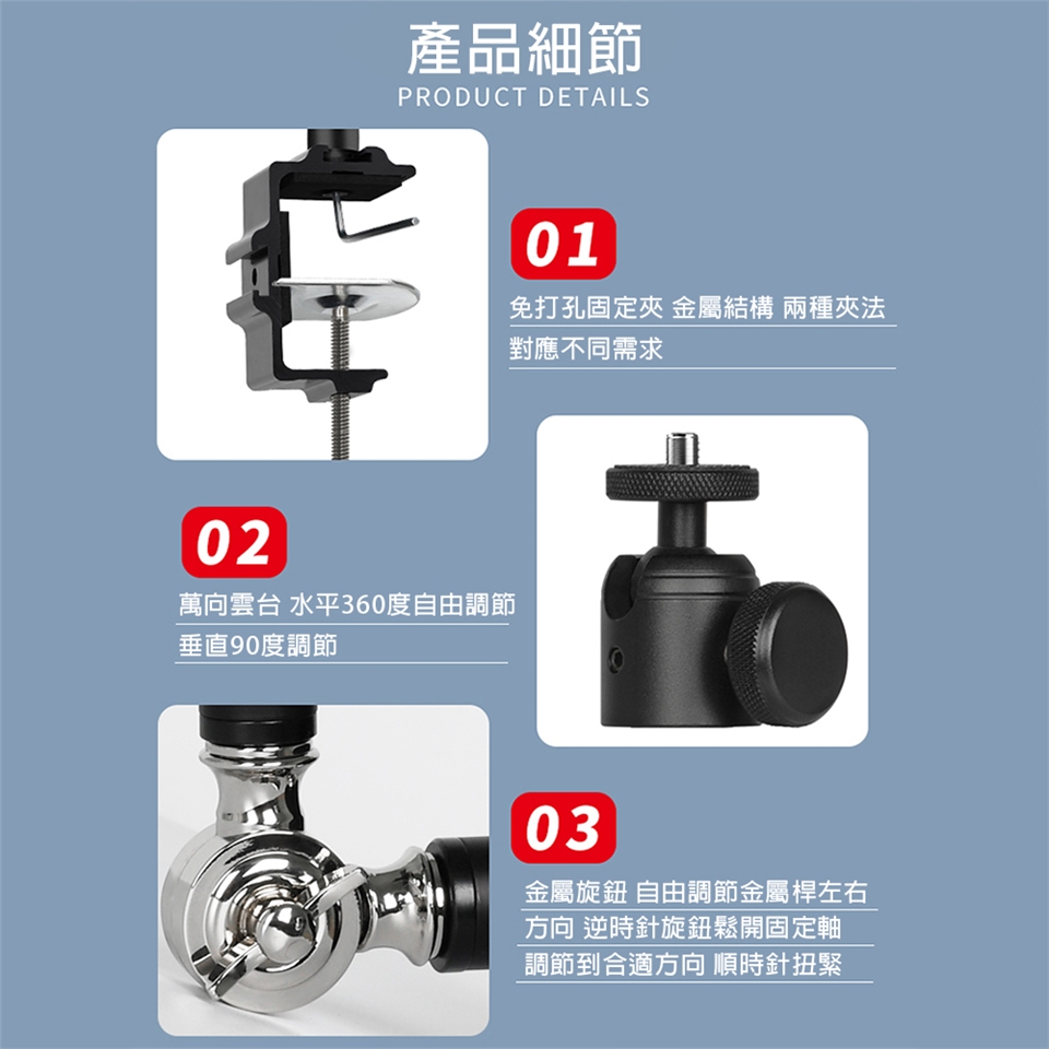 產品優勢:萬象調節、金屬旋鈕、強力固定夾