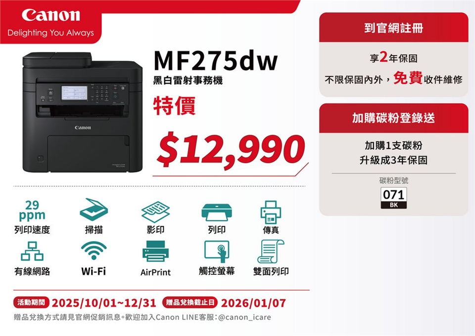 ★請注意:印表機購買金額若低於贈品最低登錄金額(詳見官網),恕不再適用原廠上網登錄送活動。