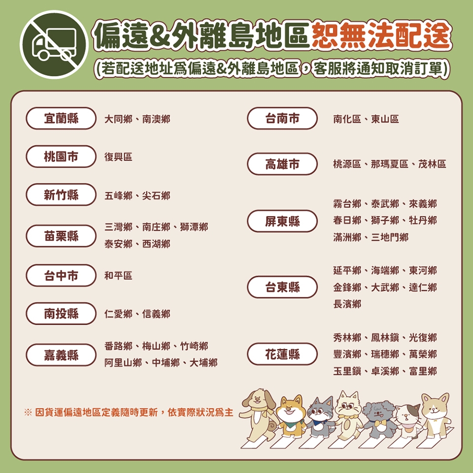 2. 商品頁面中所示「偏遠&外離島地區」無法配送,請勿下單,避免取消訂單