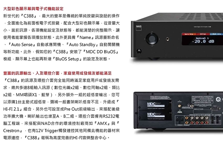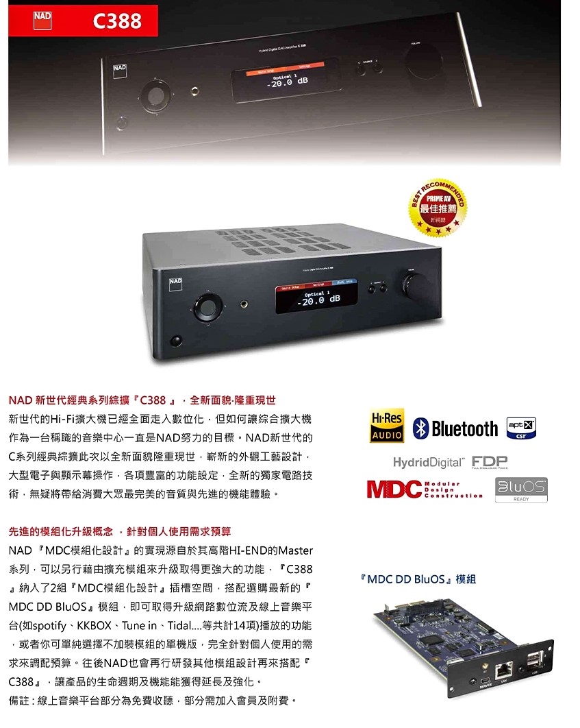 NAD 『MDC 模組化設計』的實現源自於其高階 HI-END 的 Master 系列,可以另行藉由擴充模 組來升級取得更強大的功能,『C368』和『C388』皆納入了 2 組『MDC 模組化設計』插槽空 間,搭配選購最新的『MDC DD BluOS』模組,即可取得升級網路數位流及線上音樂平台(如 spotify、KKBOX、Tune in、Tidal….等共計 14 項)播放的功能,或者你可單純選擇不加裝模組的 單機版,完全針對個人使用的需求來調配預算。往後 NAD 也會再行研發其他模組設計再來搭 配『C368』和『C388』,讓產品的生命週期及機能能獲得延長及強化。 備註 : 線上音樂平台部分為免費收聽,部分需加入會員及附費。