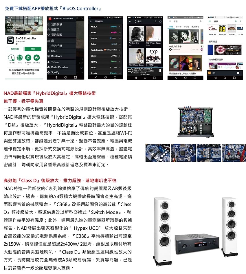 NAD 將這一代新款的 C 系列綜擴捨棄了傳統的變壓器及 AB 類後級輸出設計,過去,傳統的 AB 類擴大機播放長時間會產生高溫,進而影響音質的機器壽命。『C368』和『C388』改採用 新開發的高效能『Class D』類後級放大,電源供應改以新型交換式『Switch Mode』,整體運 作幾乎沒有溫度;此外,運用最先進的量測儀器所取得的數據報告,NAD 發展出獨家客製化 的 ”Hypex UCD” 放大線路來配合高效能的交換式電源供應系統,『C368』平均持續輸出可達 至 2x80W(橋接模式單聲道 160W),瞬間峰值更是超過 250W(橋接模式單聲道 400W/ 2 歐姆); 『C388』平均持續輸出可達至 2x150W,瞬間峰值更是超過 2x400W/ 2 歐姆,絕對足以應付 所有大動態的音樂與落地喇叭。『Class D』類後級是運用線性放大的方式,長時間播放完全無 傳統 AB 類較易衰竭、失真等問題,已是目前音響界一致公認理想擴大技術。