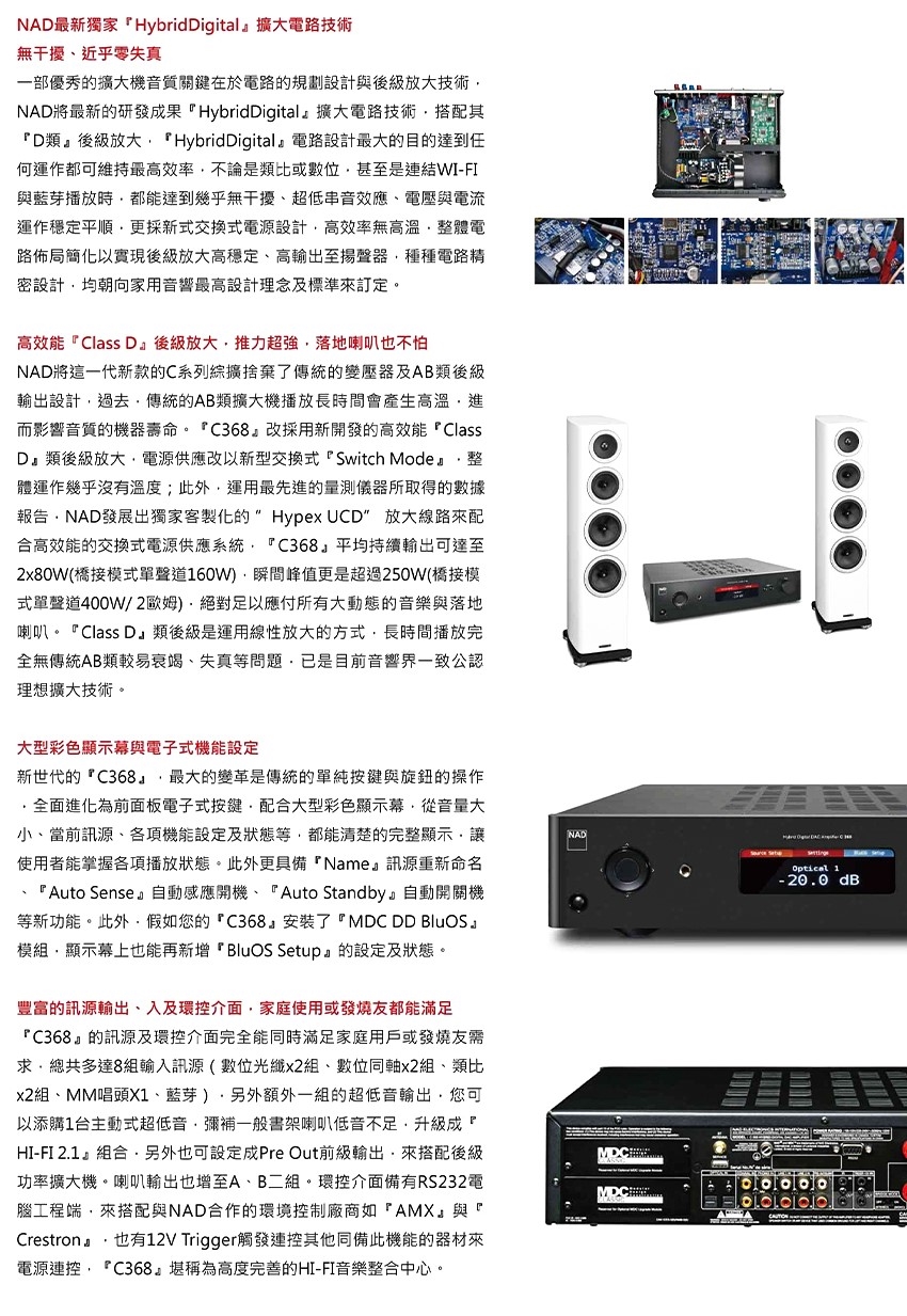NAD 將這一代新款的 C 系列綜擴捨棄了傳統的變壓器及 AB 類後級輸出設計,過去,傳統的 AB 類擴大機播放長時間會產生高溫,進而影響音質的機器壽命。『C368』和『C388』改採用 新開發的高效能『Class D』類後級放大,電源供應改以新型交換式『Switch Mode』,整體運 作幾乎沒有溫度;此外,運用最先進的量測儀器所取得的數據報告,NAD 發展出獨家客製化 的 ”Hypex UCD” 放大線路來配合高效能的交換式電源供應系統,『C368』平均持續輸出可達 至 2x80W(橋接模式單聲道 160W),瞬間峰值更是超過 250W(橋接模式單聲道 400W/ 2 歐姆); 『C388』平均持續輸出可達至 2x150W,瞬間峰值更是超過 2x400W/ 2 歐姆,絕對足以應付 所有大動態的音樂與落地喇叭。『Class D』類後級是運用線性放大的方式,長時間播放完全無 傳統 AB 類較易衰竭、失真等問題,已是目前音響界一致公認理想擴大技術。