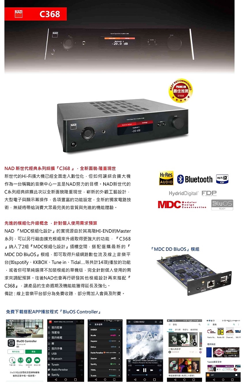 NAD 『MDC 模組化設計』的實現源自於其高階 HI-END 的 Master 系列,可以另行藉由擴充模 組來升級取得更強大的功能,『C368』和『C388』皆納入了 2 組『MDC 模組化設計』插槽空 間,搭配選購最新的『MDC DD BluOS』模組,即可取得升級網路數位流及線上音樂平台(如 spotify、KKBOX、Tune in、Tidal….等共計 14 項)播放的功能,或者你可單純選擇不加裝模組的 單機版,完全針對個人使用的需求來調配預算。往後 NAD 也會再行研發其他模組設計再來搭 配『C368』和『C388』,讓產品的生命週期及機能能獲得延長及強化。 備註 : 線上音樂平台部分為免費收聽,部分需加入會員及附費。