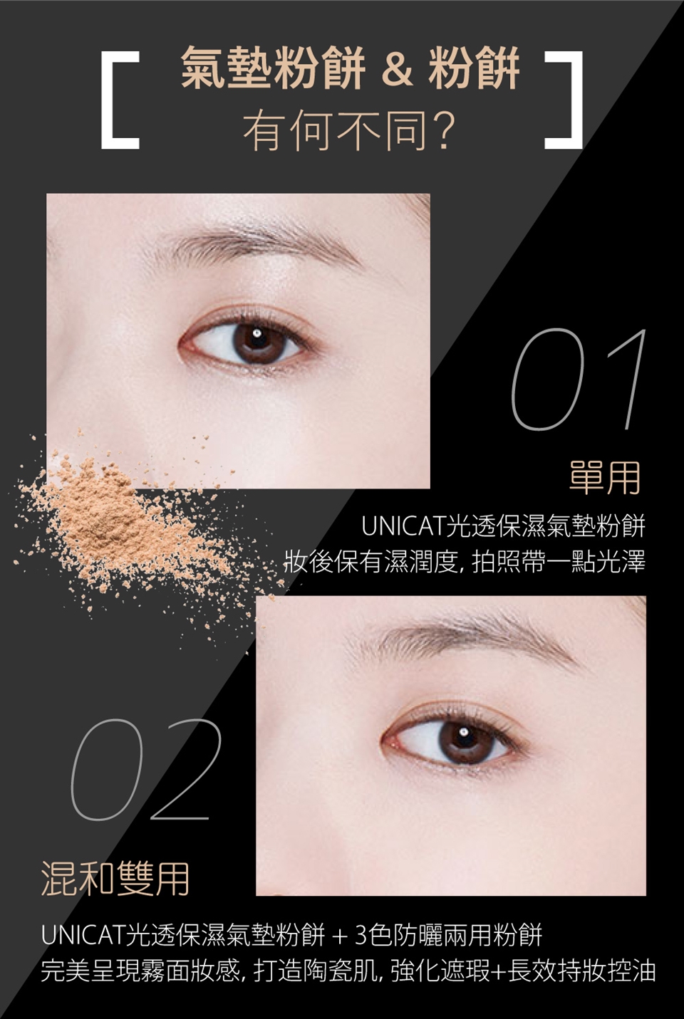 全新三色混搭粉餅,利用色彩打造時尚流行小臉裸肌美妝,強化遮瑕感,持妝力及控油效果。