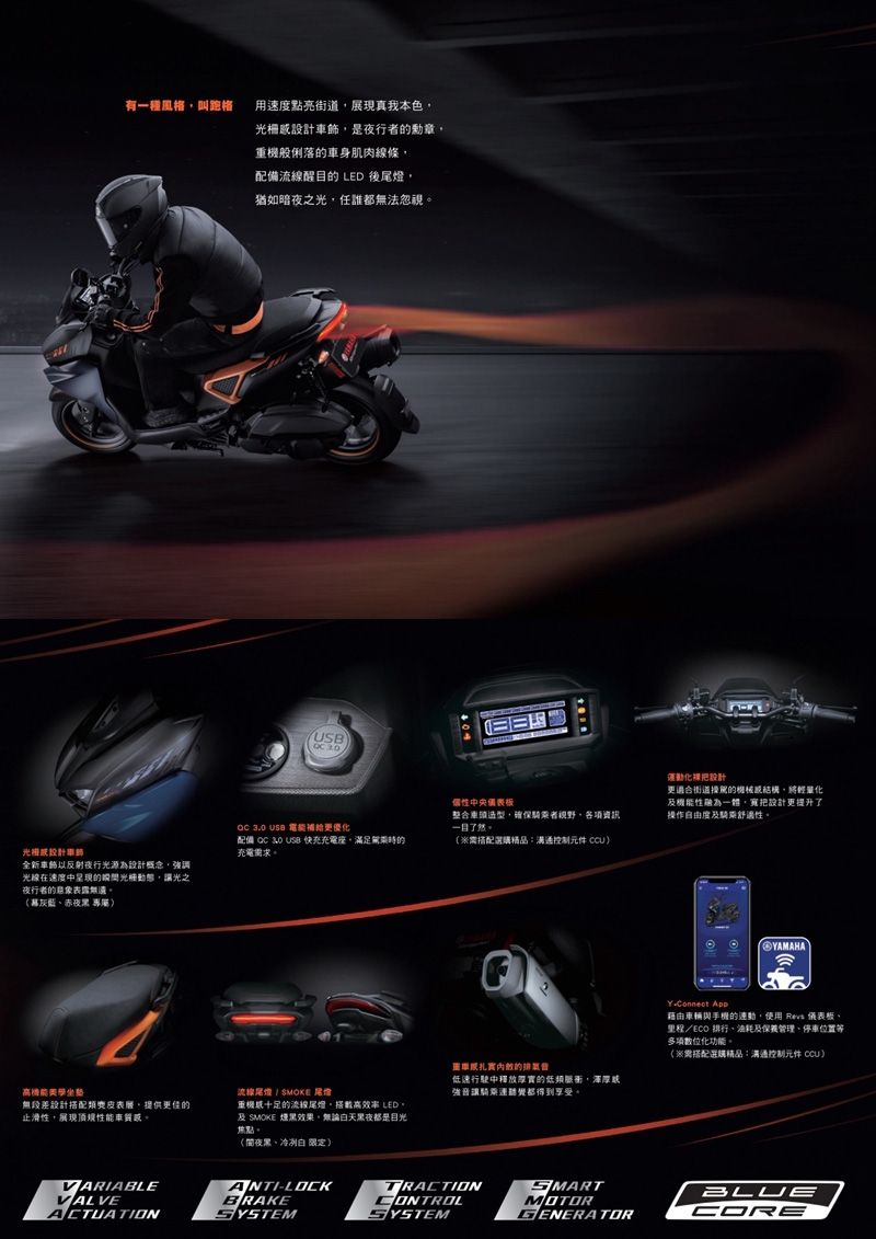「Fanatic Riding」的設計朝向新一代輕量化、高剛性的車架,搭配Traction Control System (循跡控制系統)、Anti-lock Braking System (防鎖死剎車系統) ,