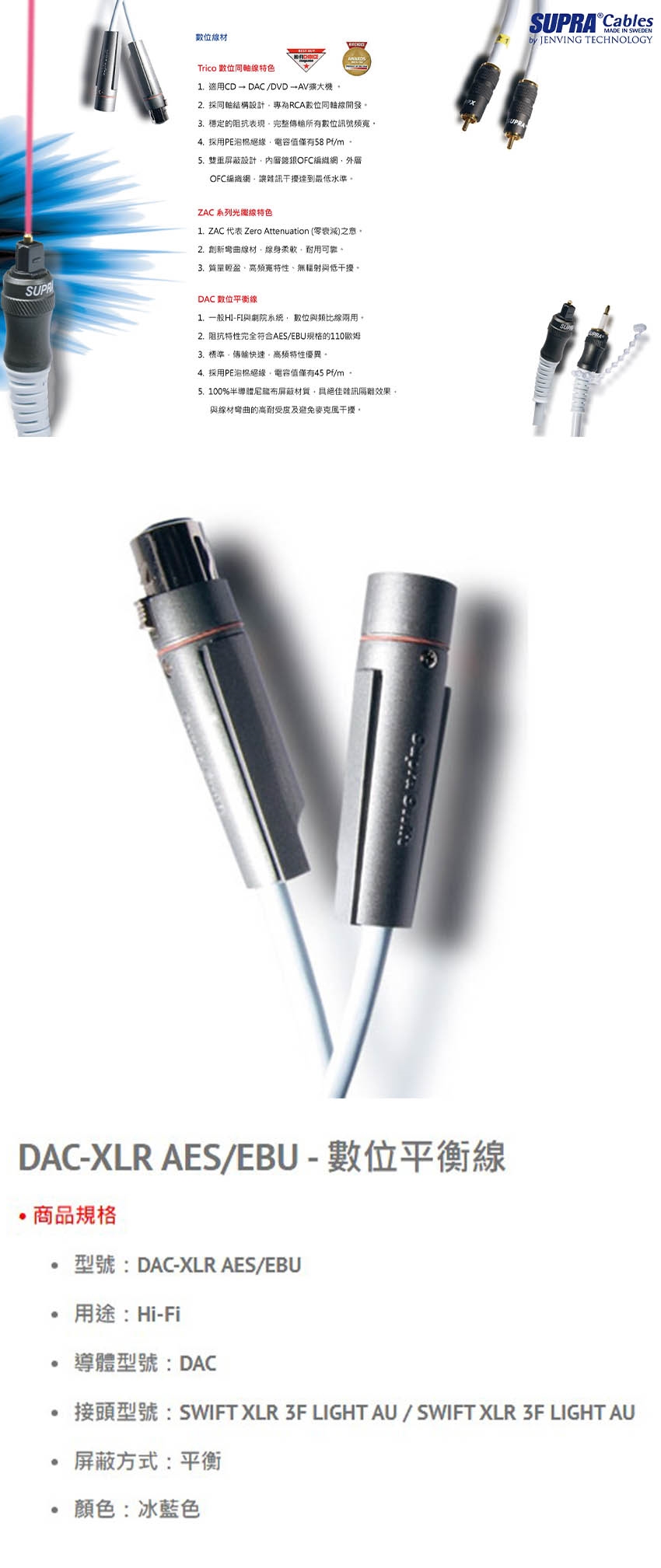 瑞典 supra 線材 DAC-XLR AES/EBU 數位平衡線/冰藍色/1M/公司貨