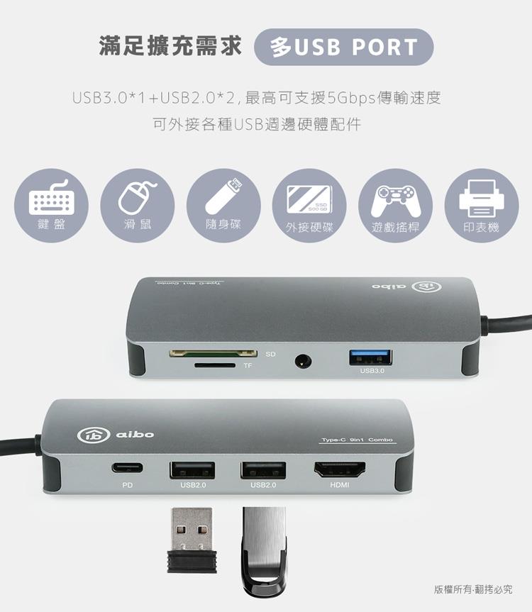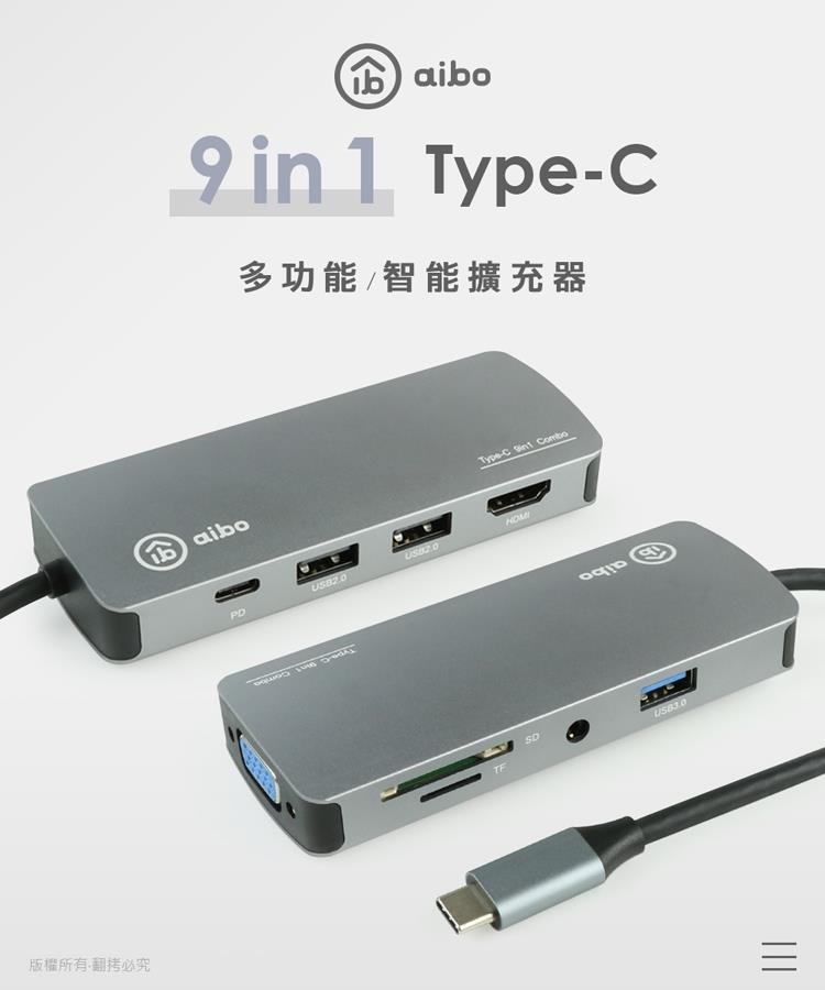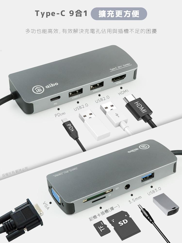 aibo TX9 Type-C 9合1 鋁合金多功能影音 智能擴充器