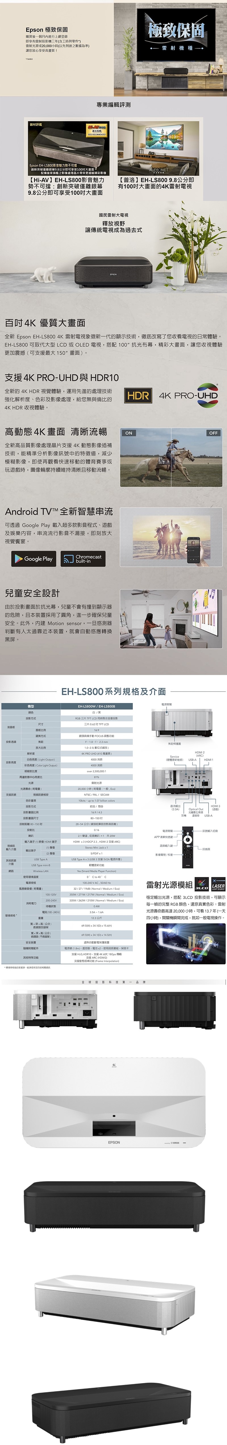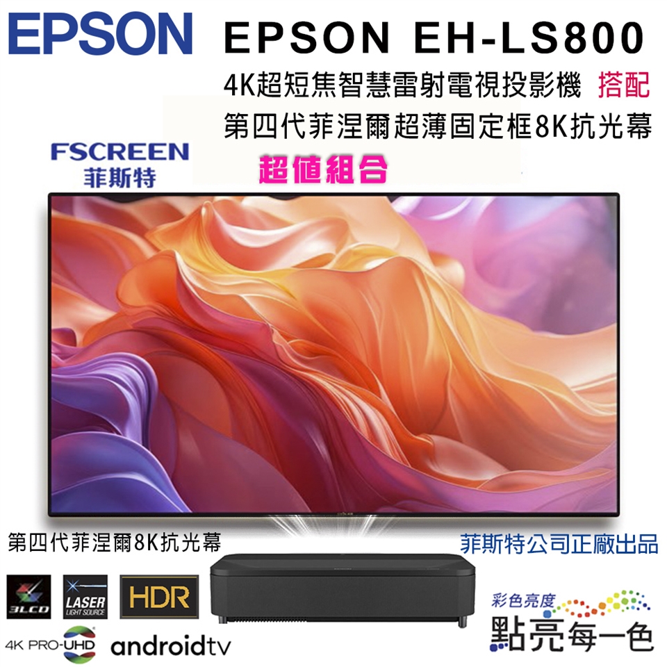 EPSON EH-LS800系列4K超短焦智慧雷射電視投影機搭配FSCREEN正廠菲涅爾100吋固定框8K抗光幕組合/含安裝
