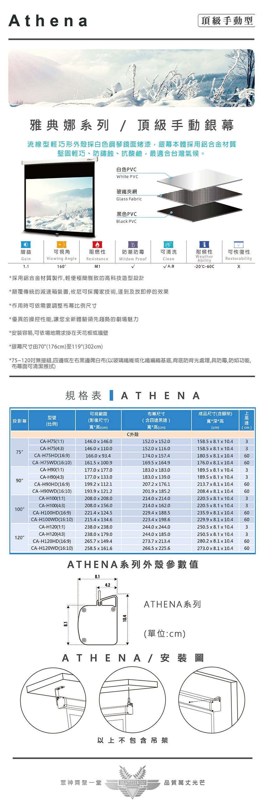 UNICO 攸尼可 雅典娜系列 CA-H120(1:1)120吋1:1手拉壁掛布幕 ~頂級型 另售100吋1:1