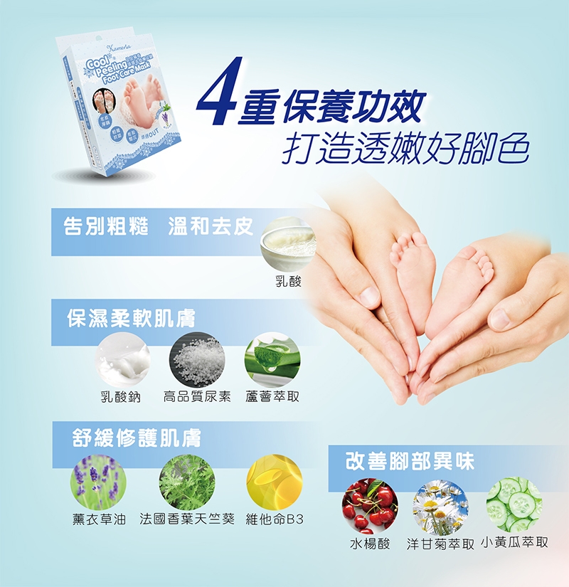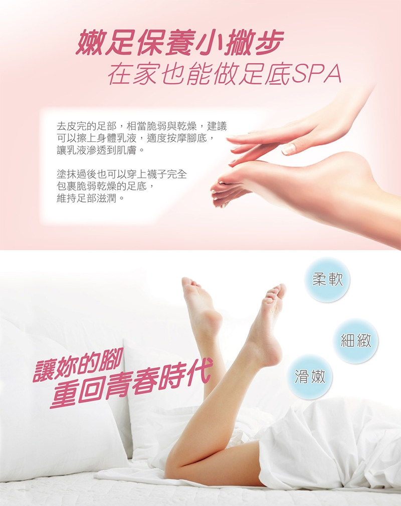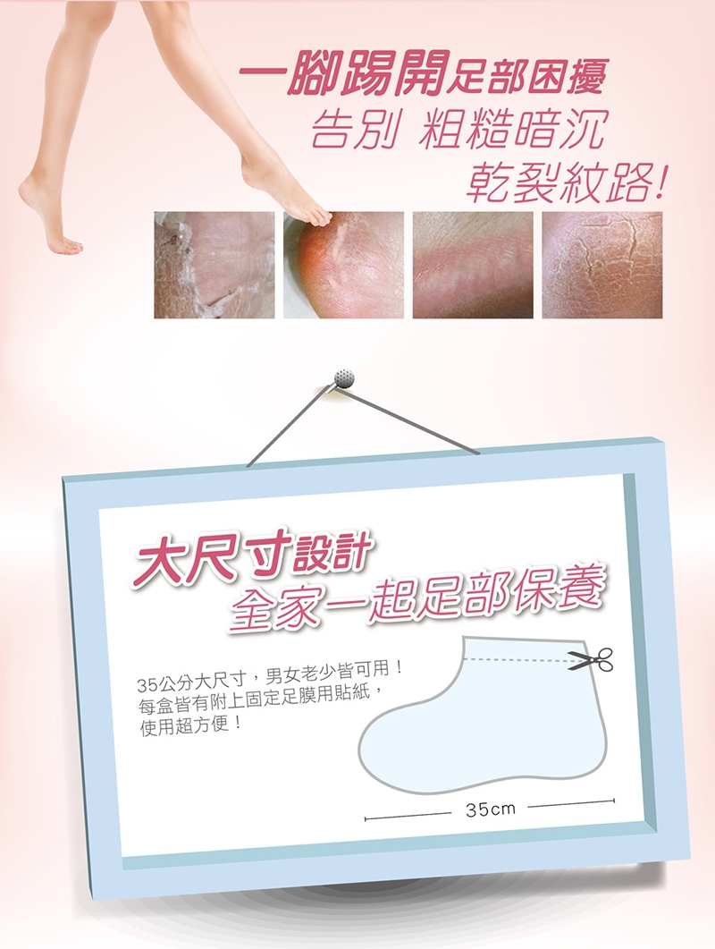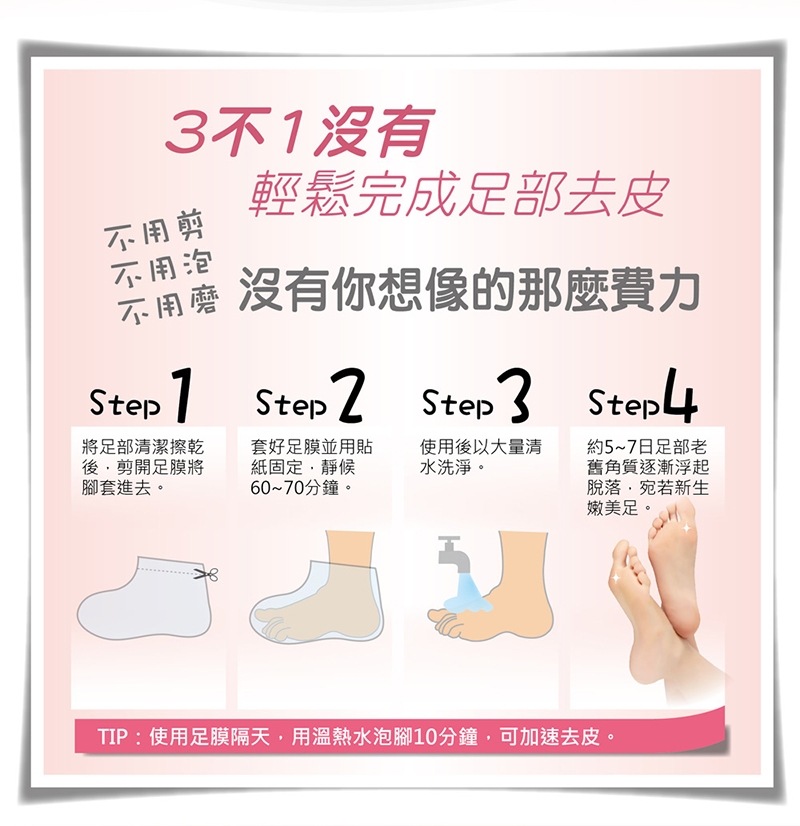 TIP:使用足膜隔天,用溫熱水泡腳10分鐘,可加速舊皮更新。