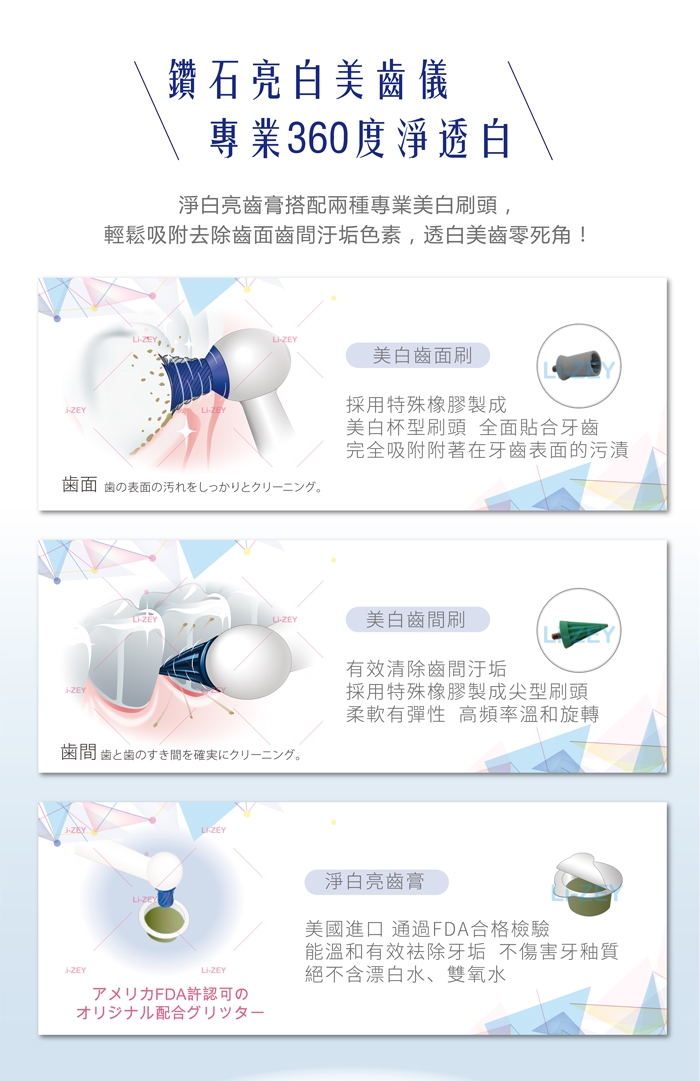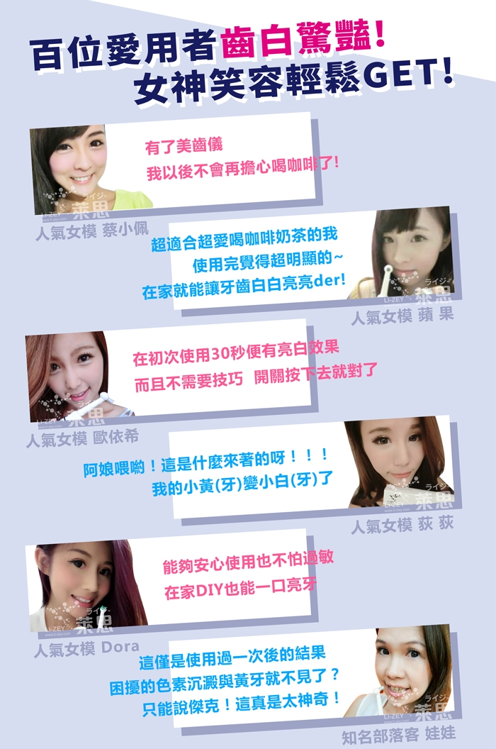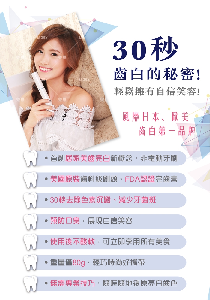 8.亮齒膏根據保存狀態不同,會有乾燥分離的現象,這是正常情況請放心使用(分離:請攪拌之後使用,乾燥:請在亮齒膏裡加1、2滴飲用水後使用),請配合正確刷牙習慣