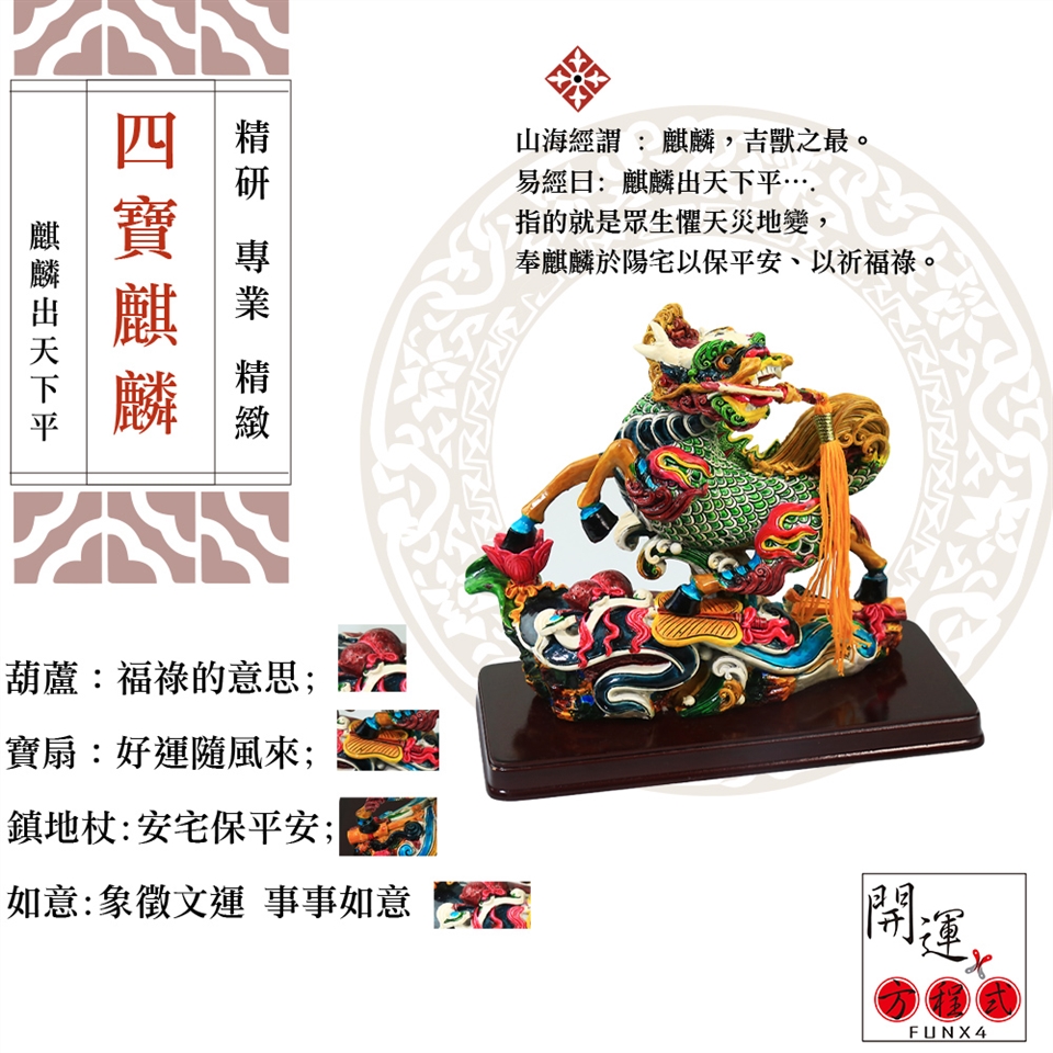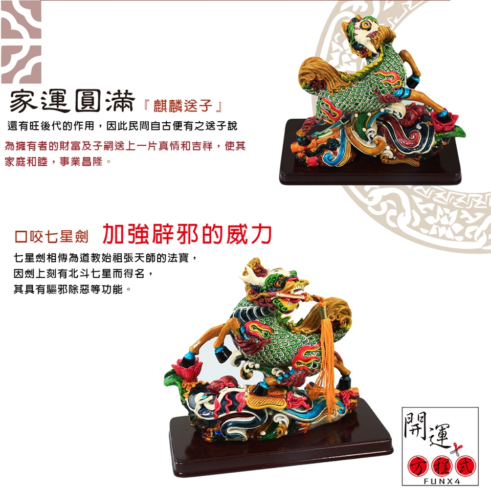 麒麟在風水中就象萬金油,旺財,鎮宅,化煞,旺人丁,求子,旺文等,各方面都可以使用。麒麟擺放在室內,還有一個最大的好處,對好人起到保護作用,但對壞人卻疾惡如仇,如發現壞人,它就會咬,因此家中擺放銅麒麟,可以旺事業,化小人,制壞人。