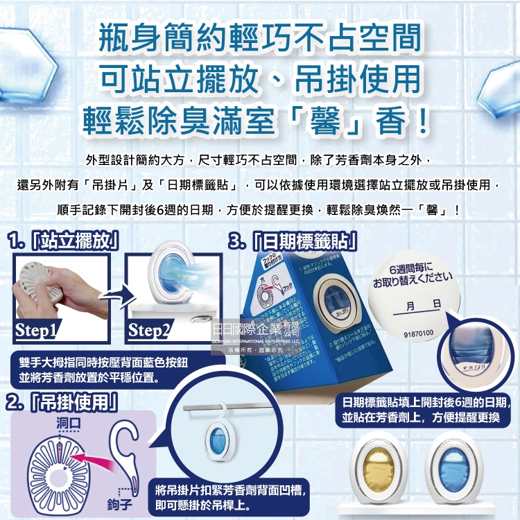 (2)香味會逐漸散發,建議放置於高於馬桶之穩固位置。