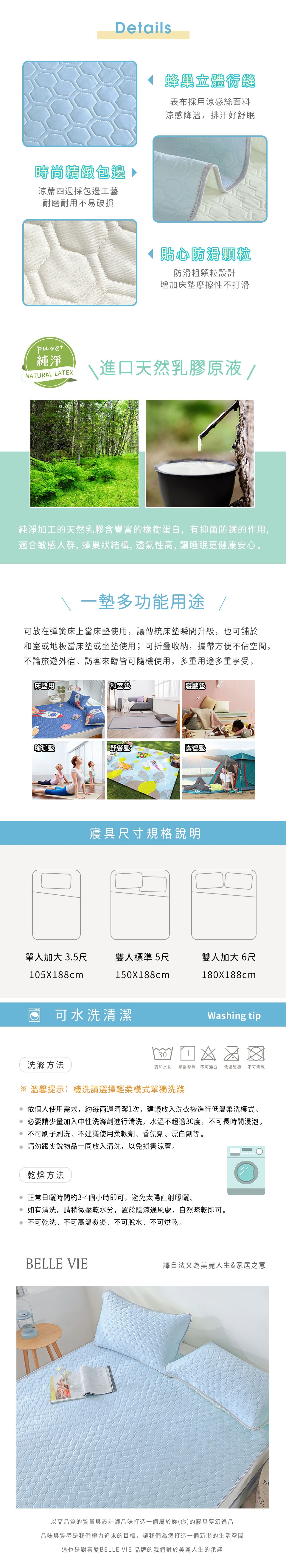 乳膠防螨防菌、彈性舒適,平均承托身體、貼合曲線,吸收分散身體各部位的壓力,且透過蜂窩式結構的立體透氣孔的熱漲冷縮調節,讓你即使趴著睡也能確保透氣舒適。