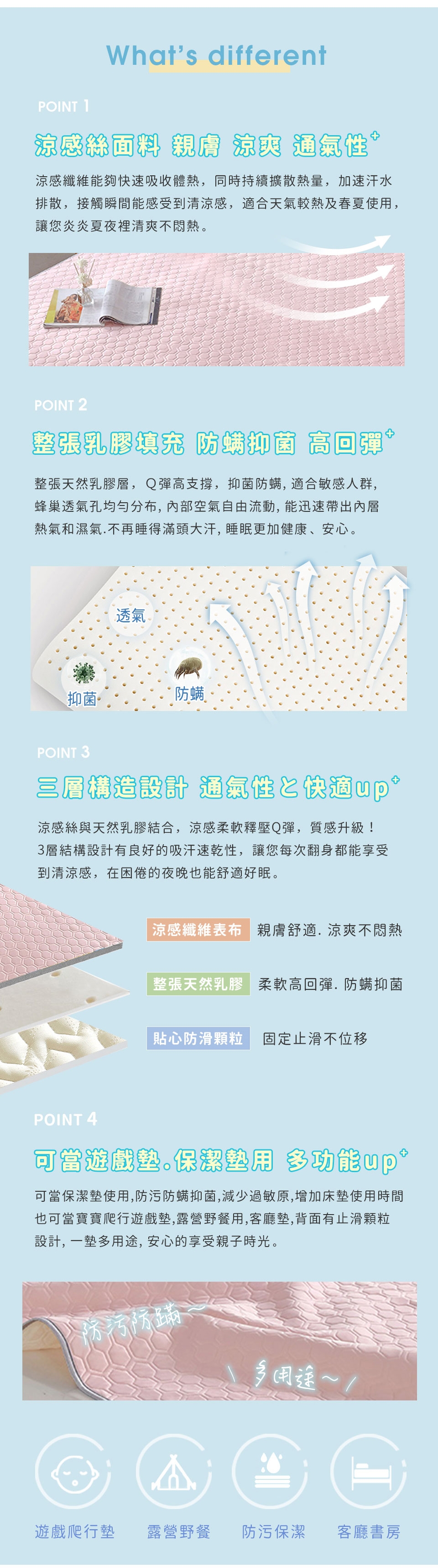 防滑顆粒設計,增加舒適性,讓涼墊不易滑動;可平鋪床墊上當保潔墊或當遊戲墊使用,多功能用途!