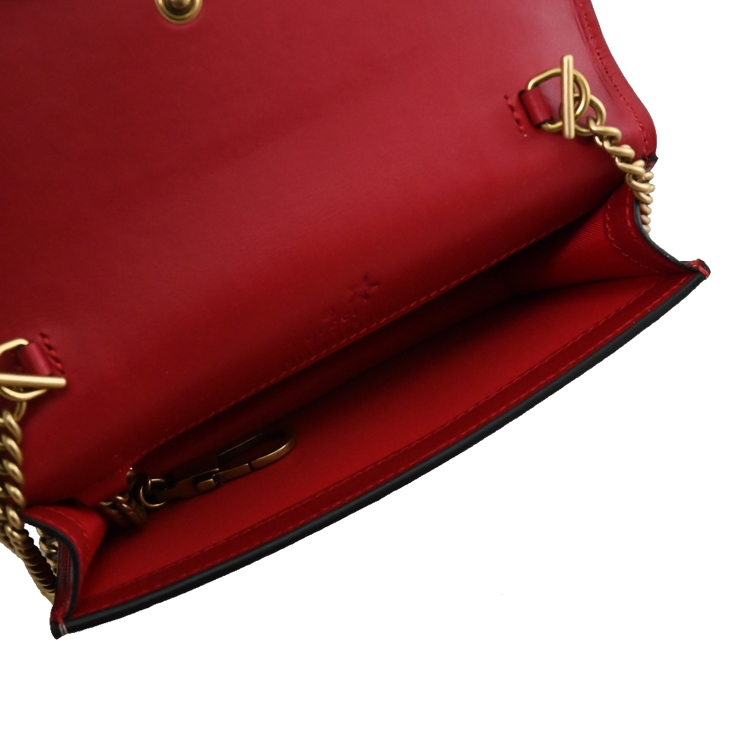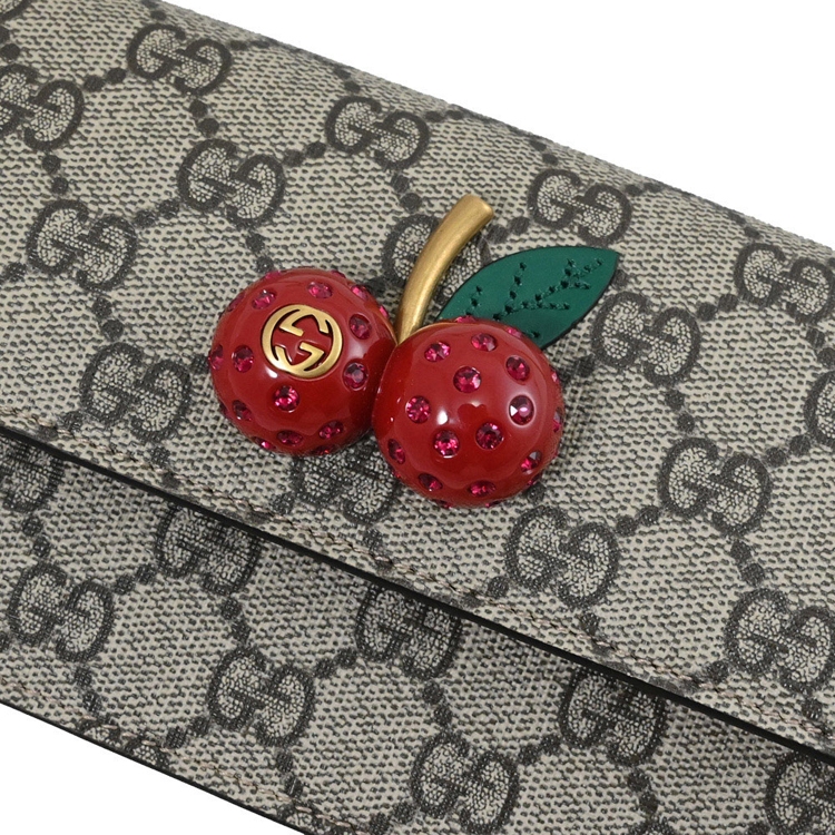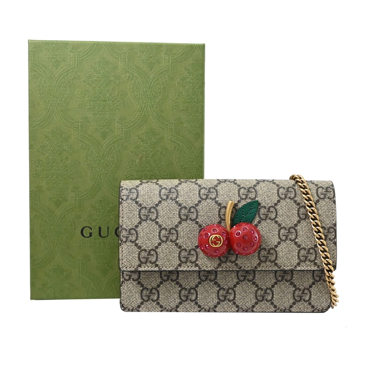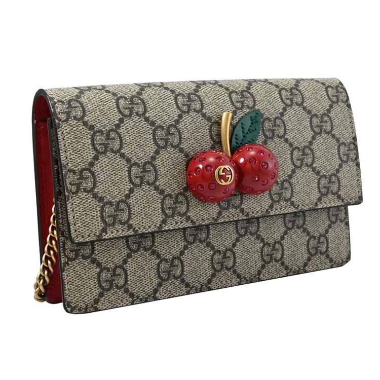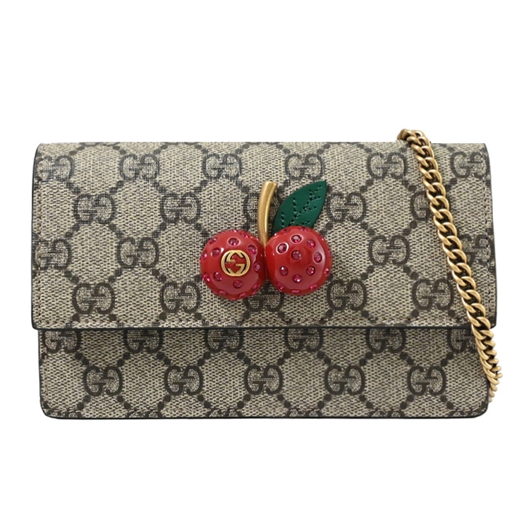 GUCCI 專櫃商品,專櫃最新款斜背翻蓋鍊包,採用經典雙G LOGO印花搭配立體水鑽櫻桃裝飾,翻蓋釦式開口/內有1彈簧扣鍊條,可掛鑰匙、零錢包等隨身小物,可容納小短夾、鑰匙及手機等小物,背帶可拆做手拿包使用,精緻古典,展現俏麗、摩登的雙重時尚感,釋放都會簡約風格!