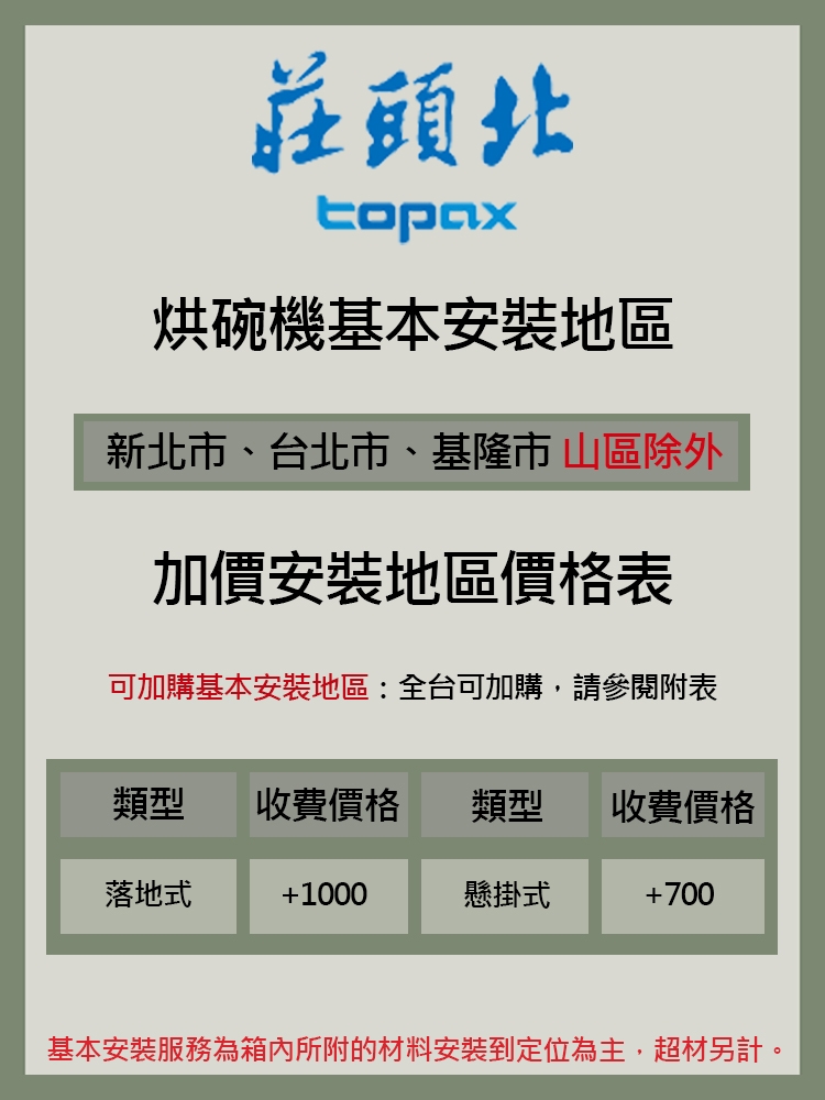 •標準安裝為箱子內原廠所附的材料安裝到定位,若現場有超材則依現場環境為主實做實收。