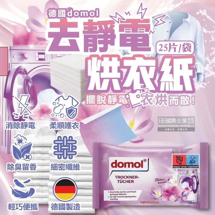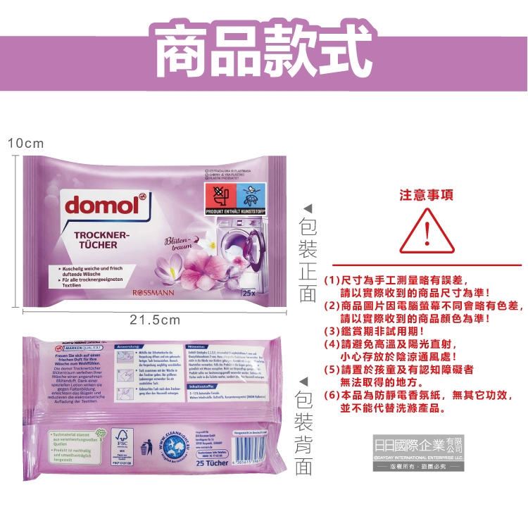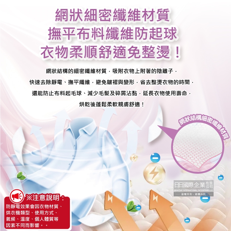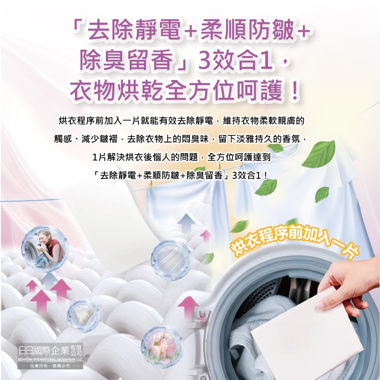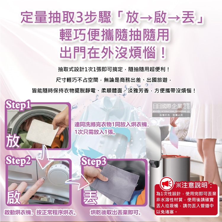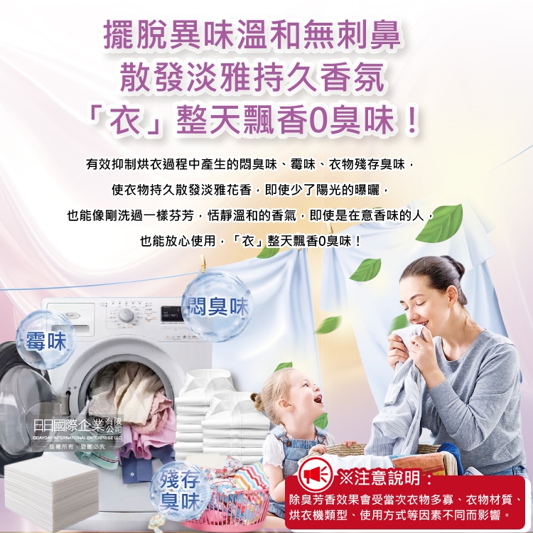 (8)為烘衣機專用去靜電香氛紙,並無洗滌功效,請勿與其它洗滌溶劑混合使用,以免衣物受損。