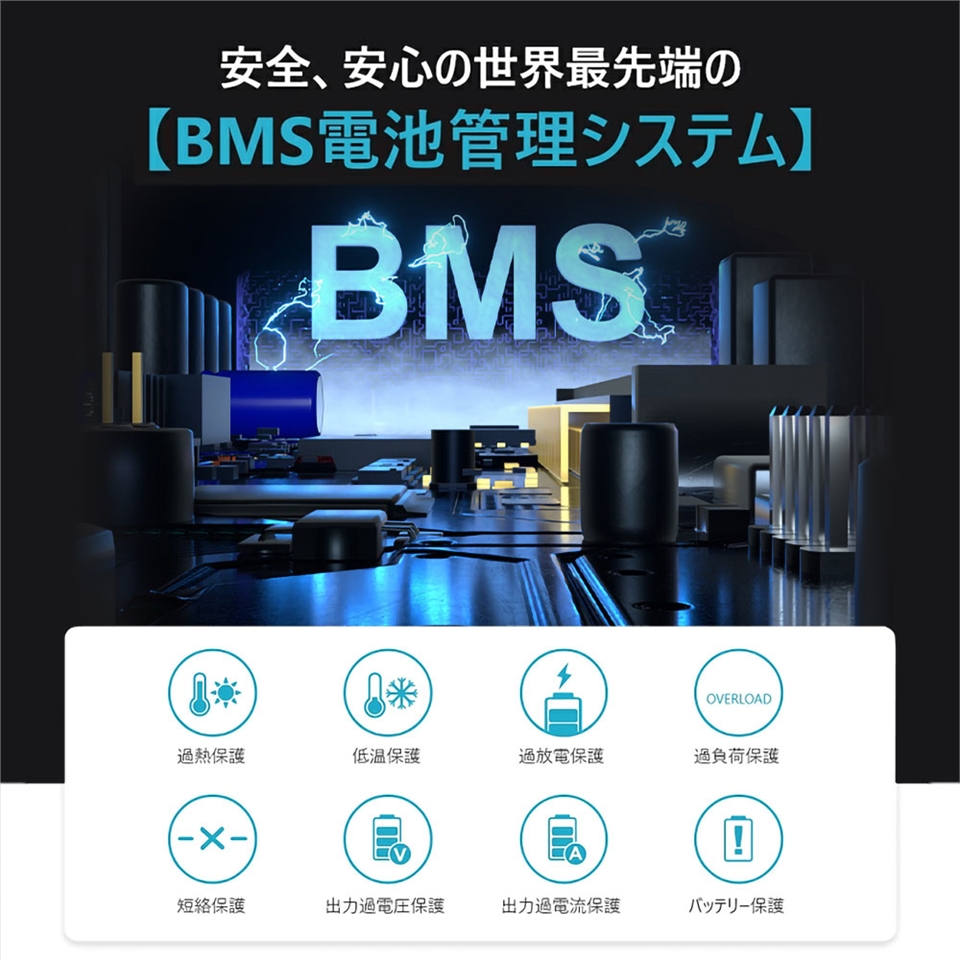 內置智慧BMS管理系統,具備過充、過放、過流、過壓、過溫、超載、短路保護等多重保護功能,避免電池過充過放引起的電池損壞,經久耐用。