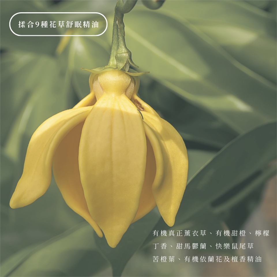 有機真正薰衣草、甜馬鬱蘭等9種花草舒眠精油,柔和的香氣宛如躺在柔軟的棉被,讓感官徹底放鬆