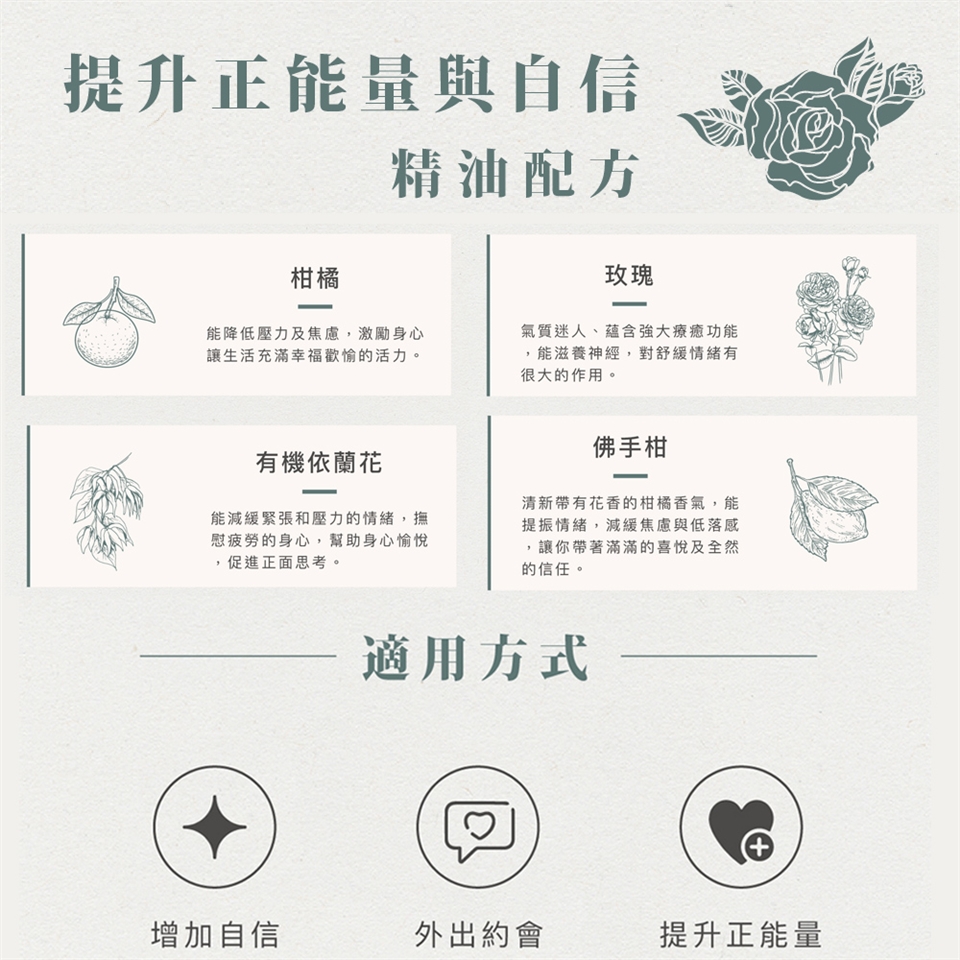 添加玫瑰精油,蘊含強大療癒功能,滋養神經,搭配柑橘、佛手柑和依蘭精油,減緩焦慮與低落感,讓生活充滿幸福歡愉的活力