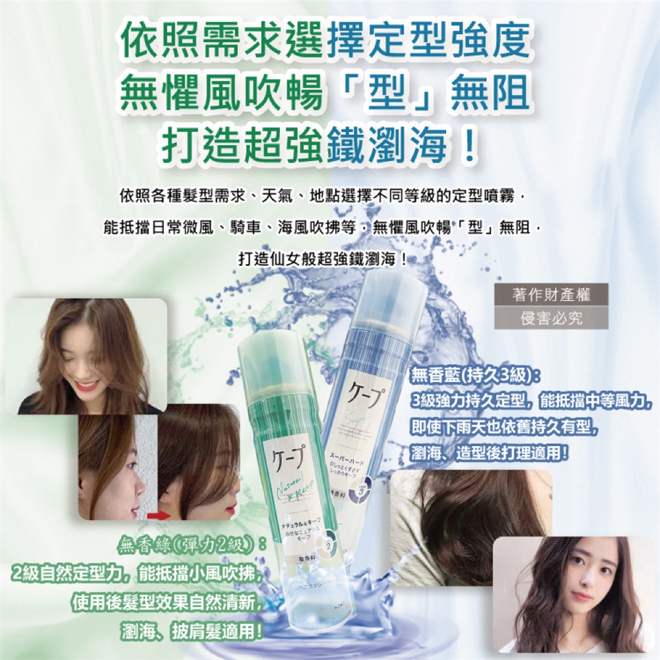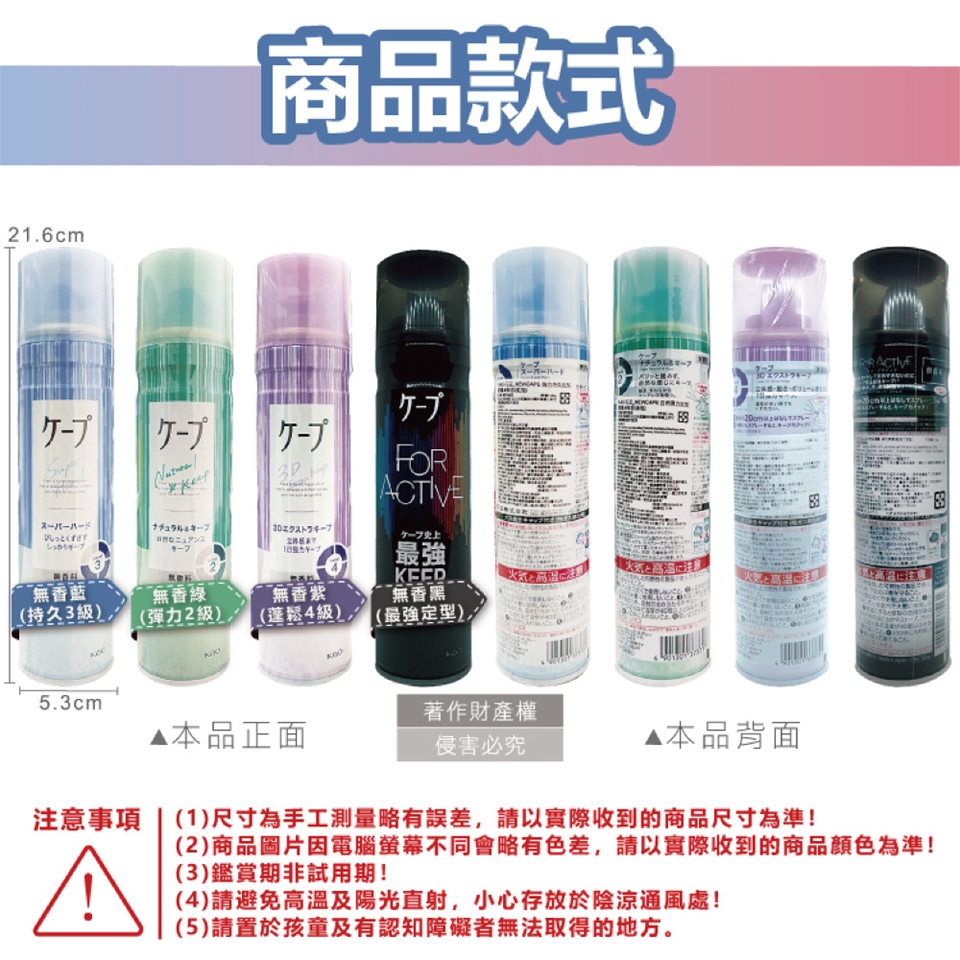 ●款式:無香綠(彈力2級)、無香藍(持久3級)、無香紫(蓬鬆4級)、無香黑(最強定型)。