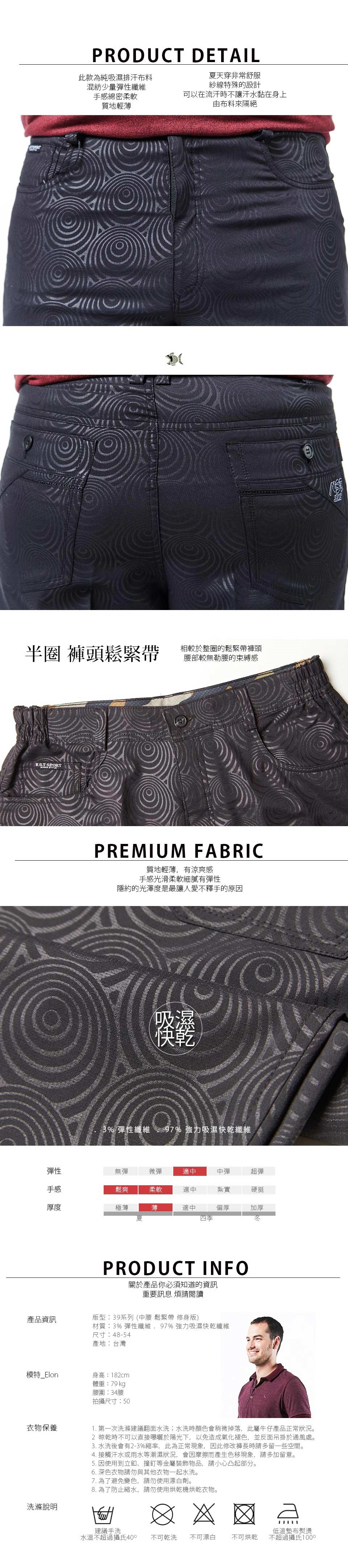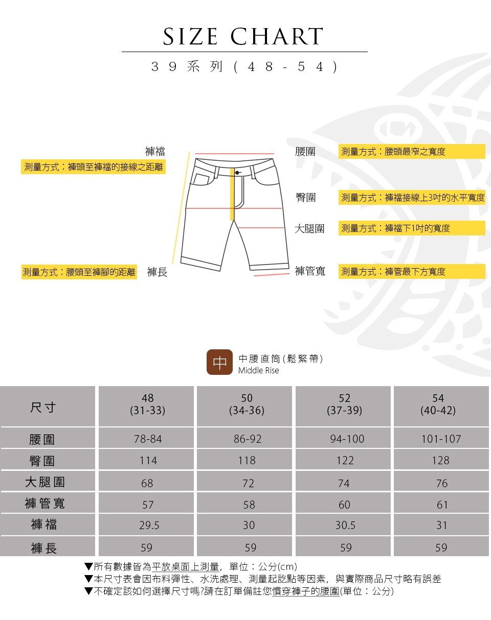 E.水洗後會有2-3%縮率,此為正 常現象,在修改褲長時請稍微增長褲長;此外,為了防止縮水,請勿使用烘乾機烘乾衣物。