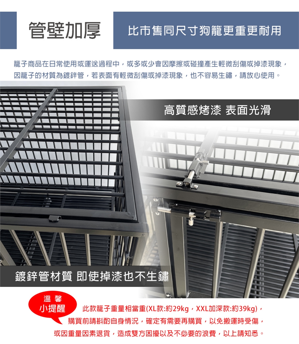 ***籠子(圍欄)商品在日常使用或運送過程中,或多或少會因摩擦或碰撞產生輕微刮傷或掉漆現象,因籠子的材質為鍍鋅管,若表面有輕微刮傷或掉漆現象,也不容易生鏽,請放心使用。