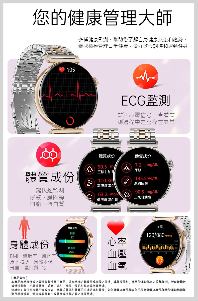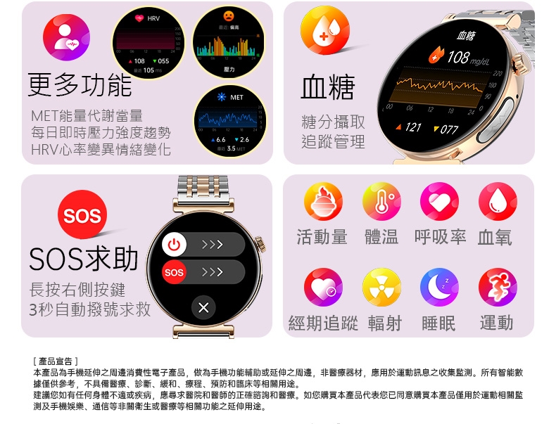 建議您如有任何身體不適或疾病,應尋求醫院和醫師的正確諮詢和醫療。如您購買本產品代表您已同意購買本產品僅用於運動相關監測及手機娛樂、通信等非關衛生或醫療等相關功能之延伸用途。