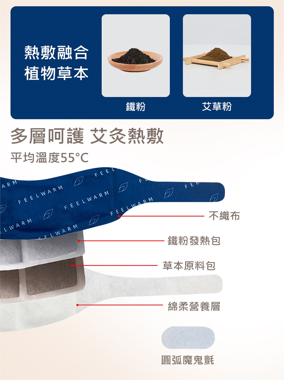 主要成分:發熱包(鐵粉、碳粉、蛭石、鹽、水等)、草本植物粉包