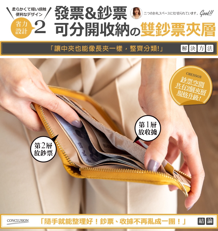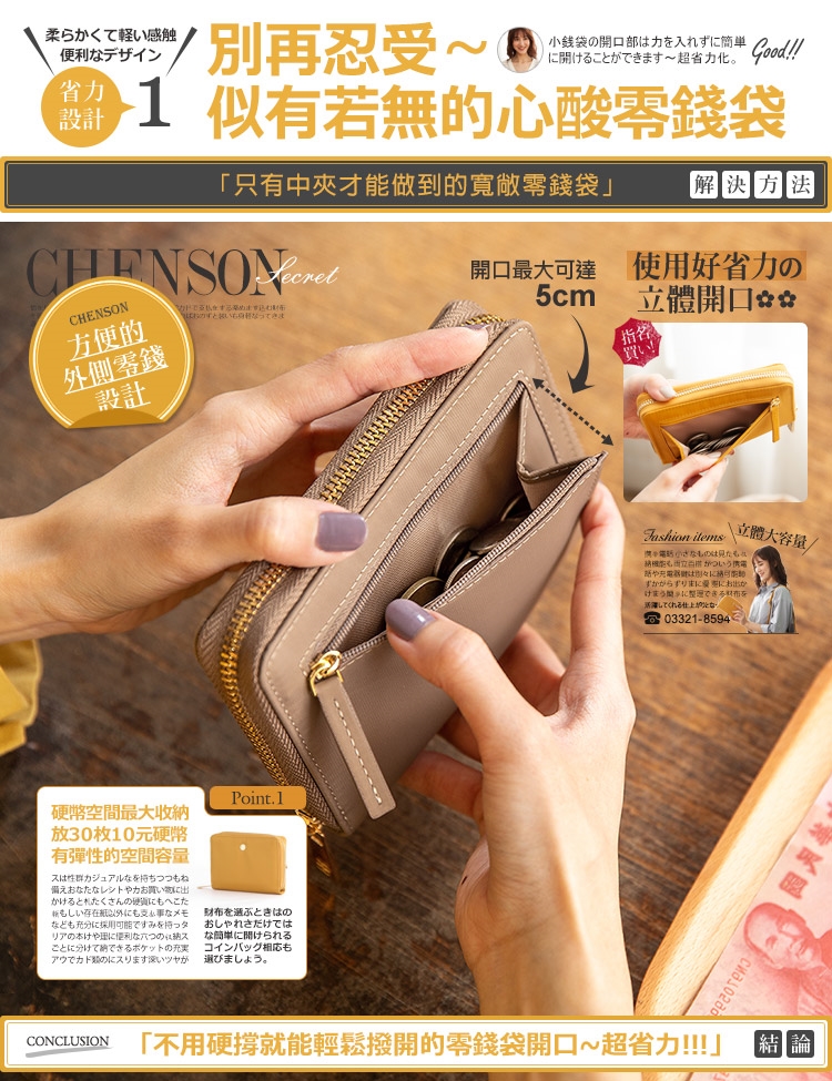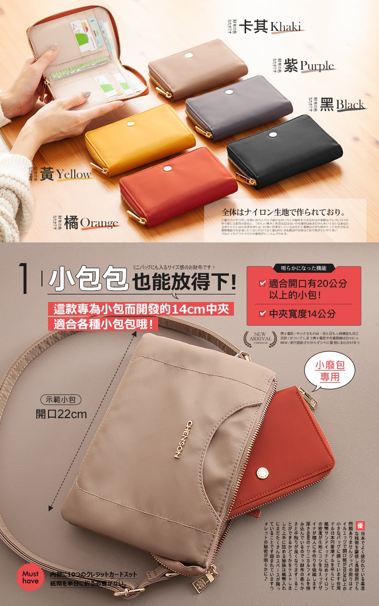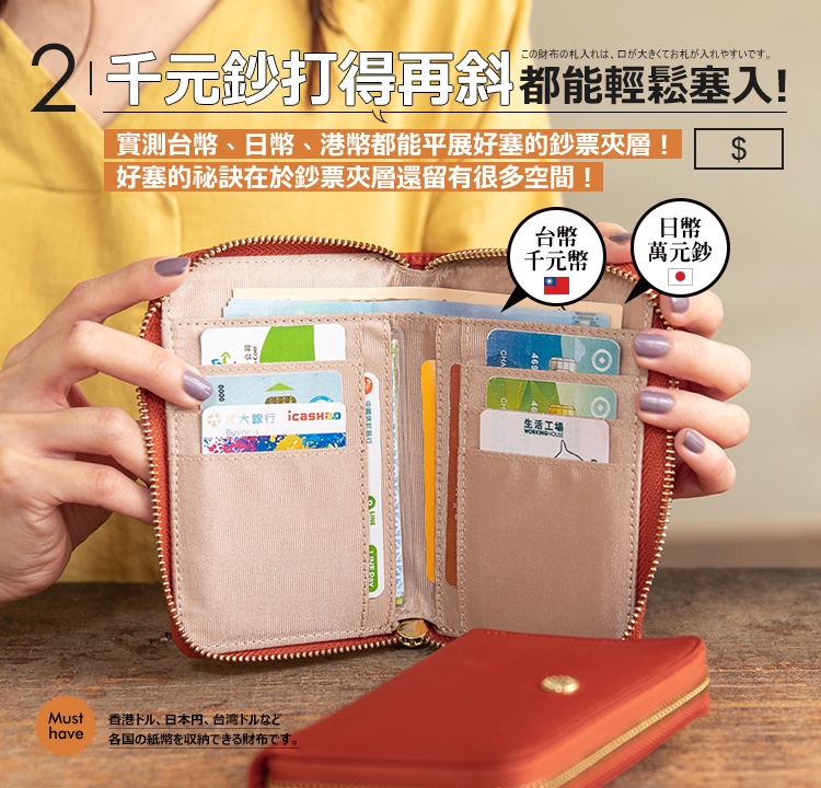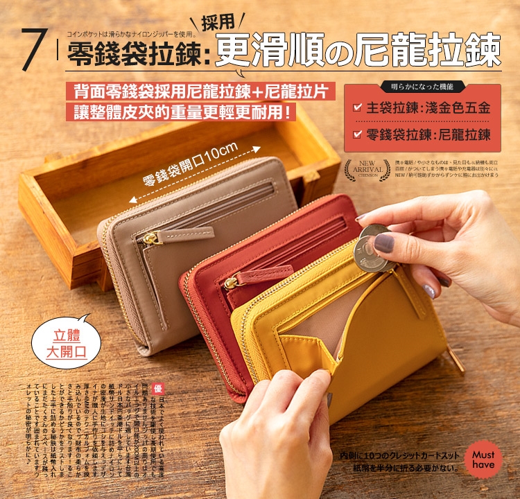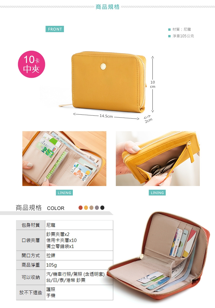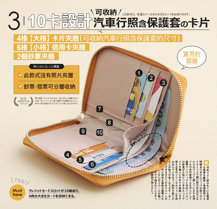 口袋夾層:鈔票夾層x2、信用卡夾層x10、獨立零錢袋x1