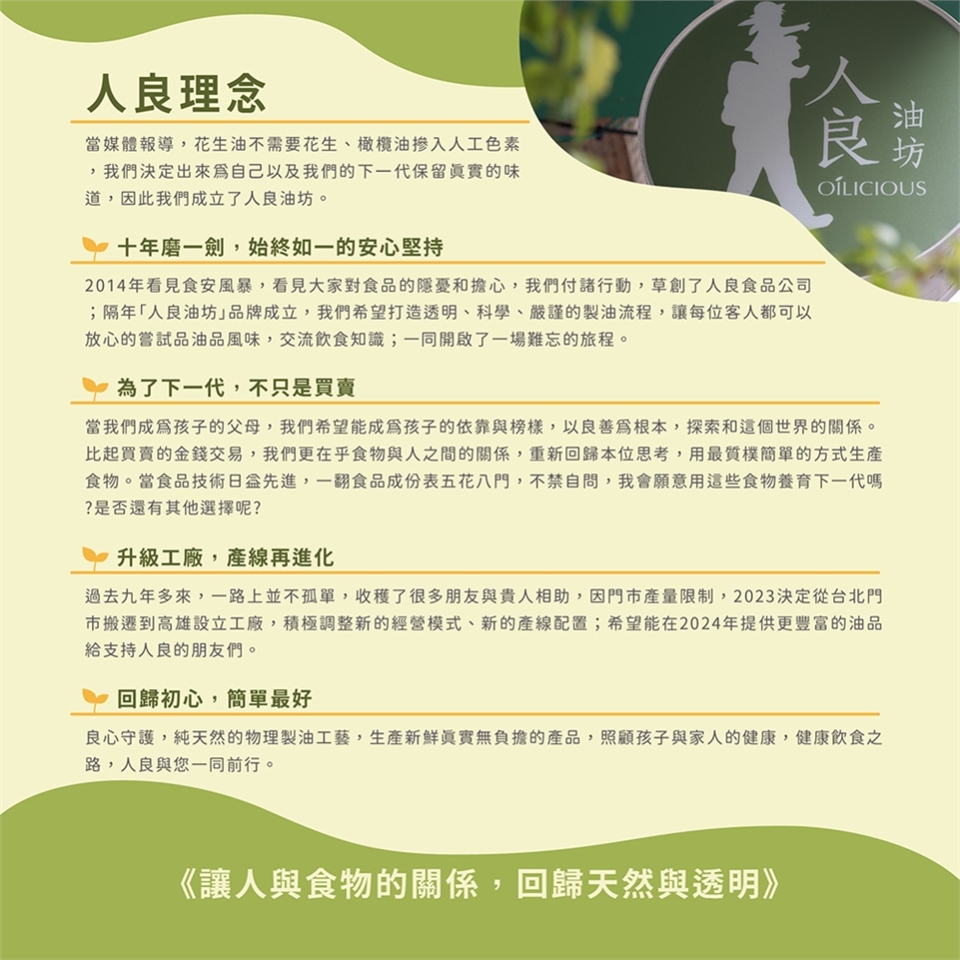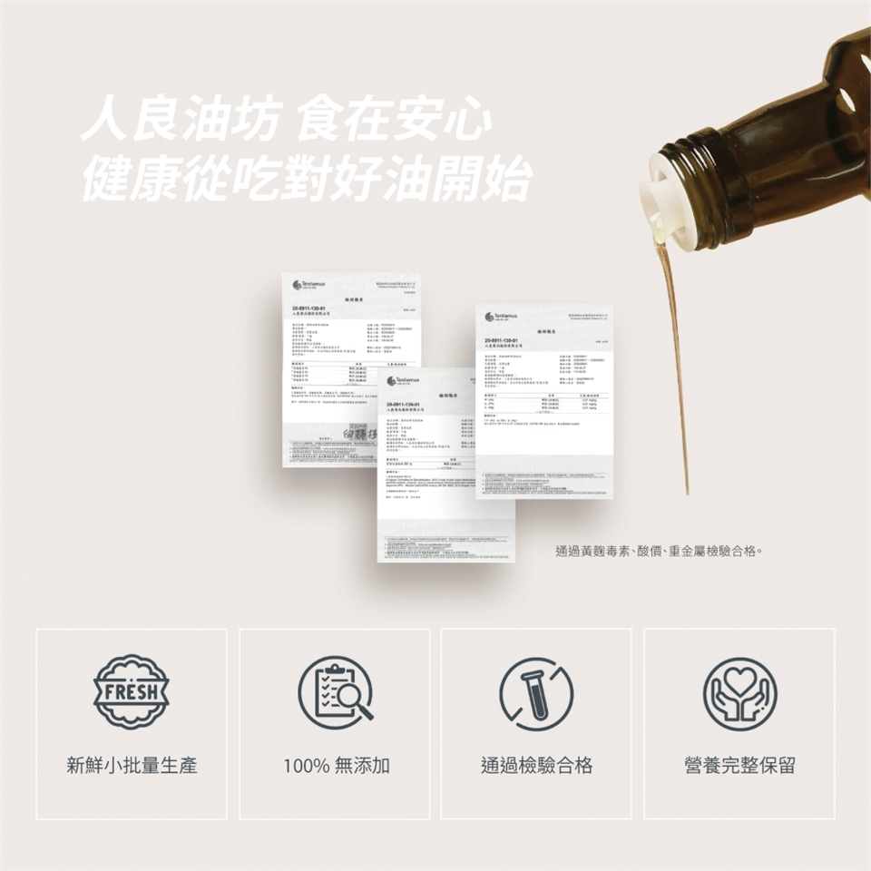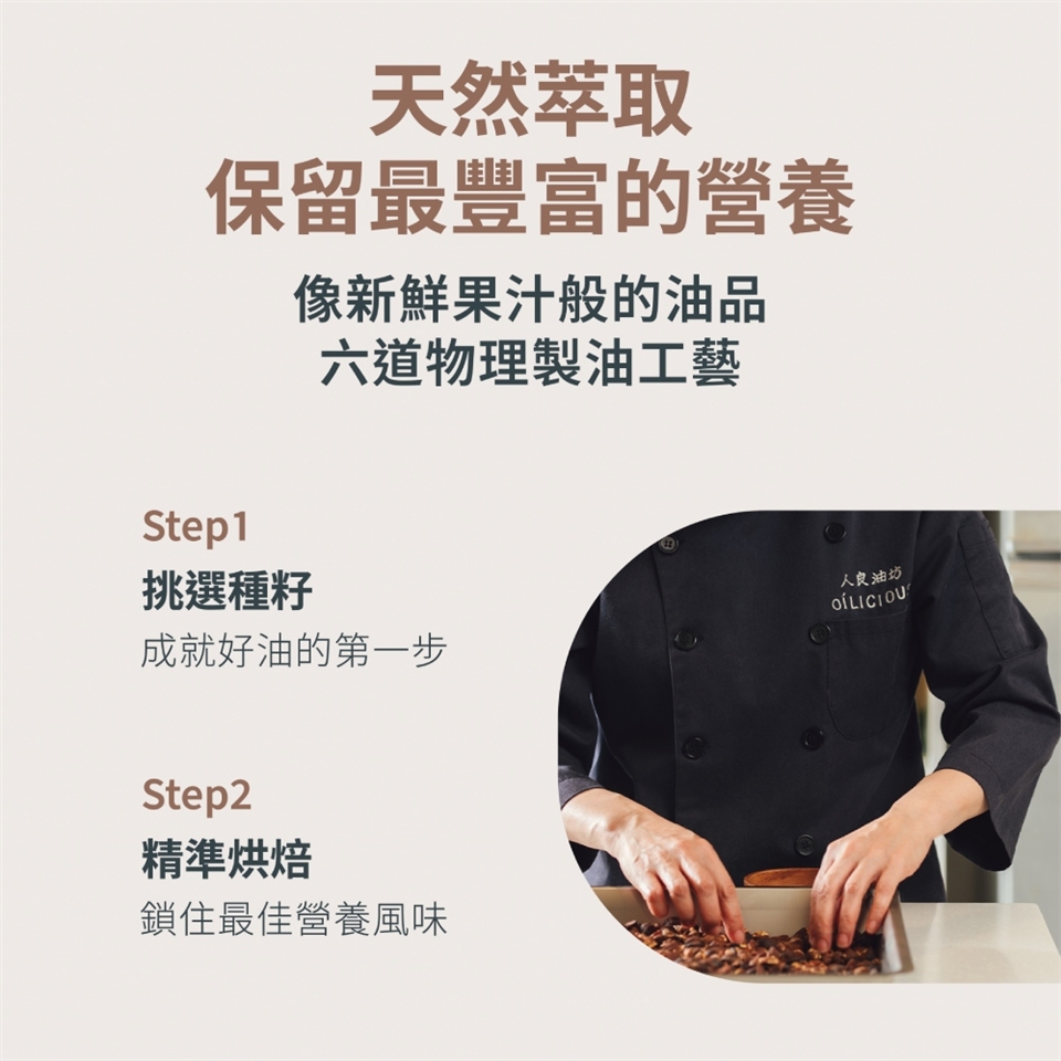 呈現100%真實的風味,是人良油坊製油的堅持