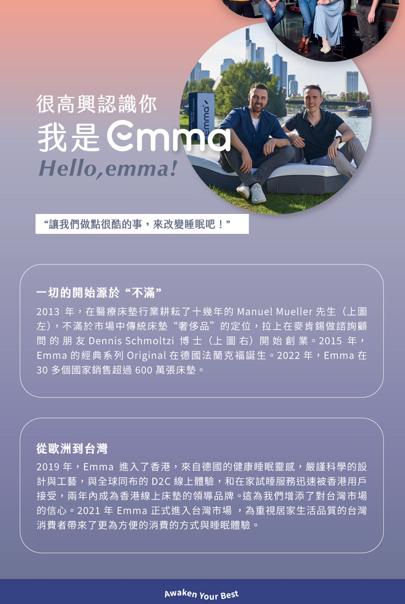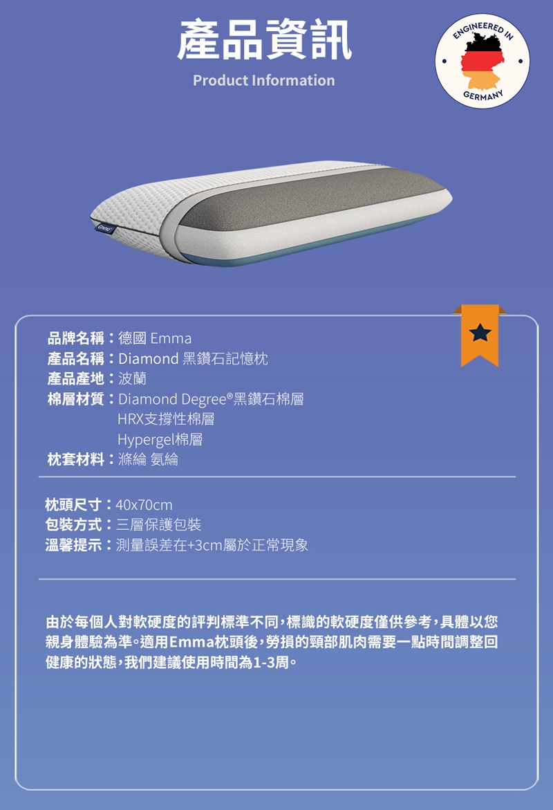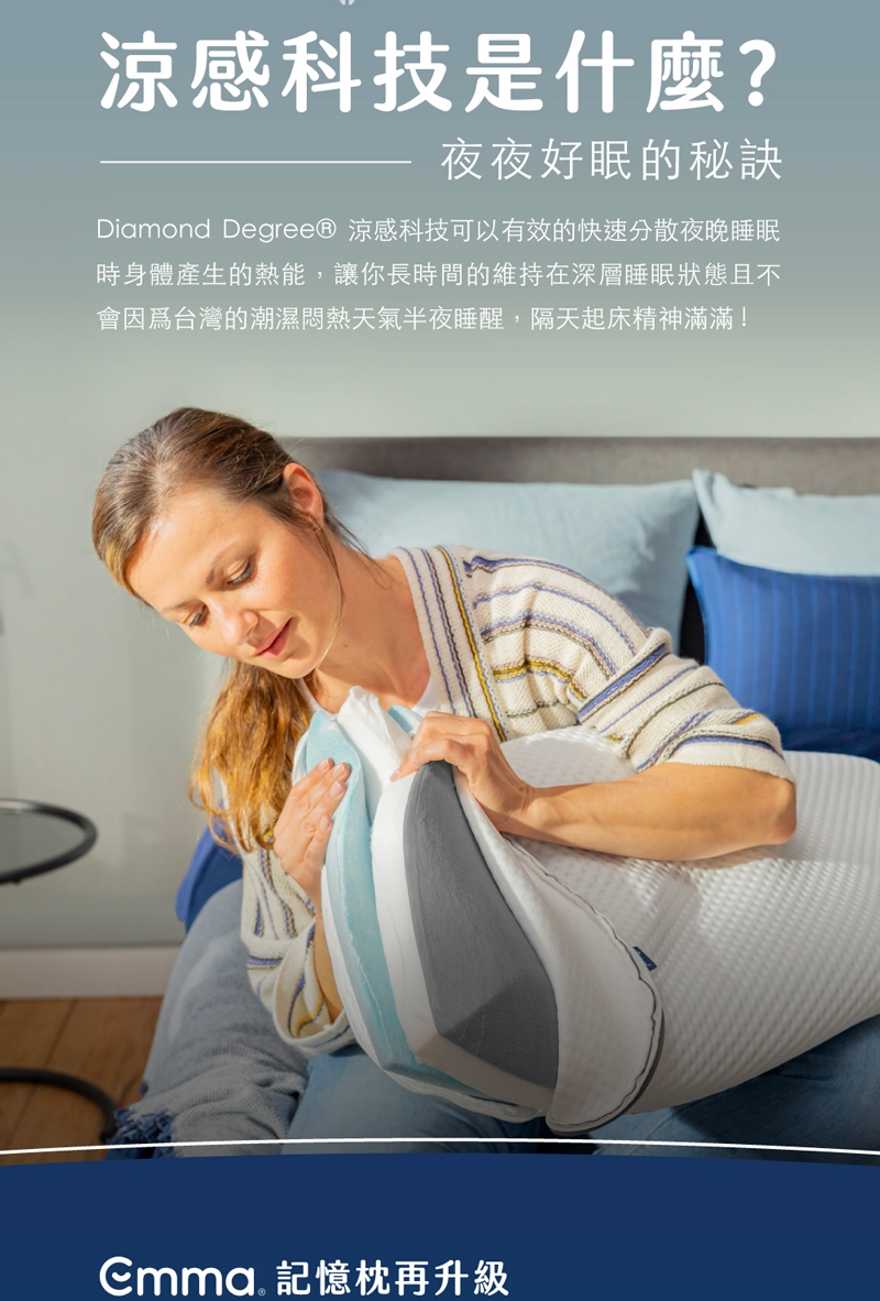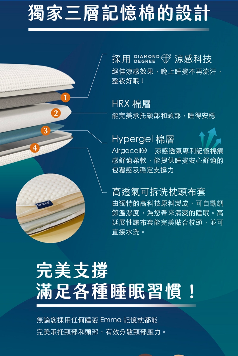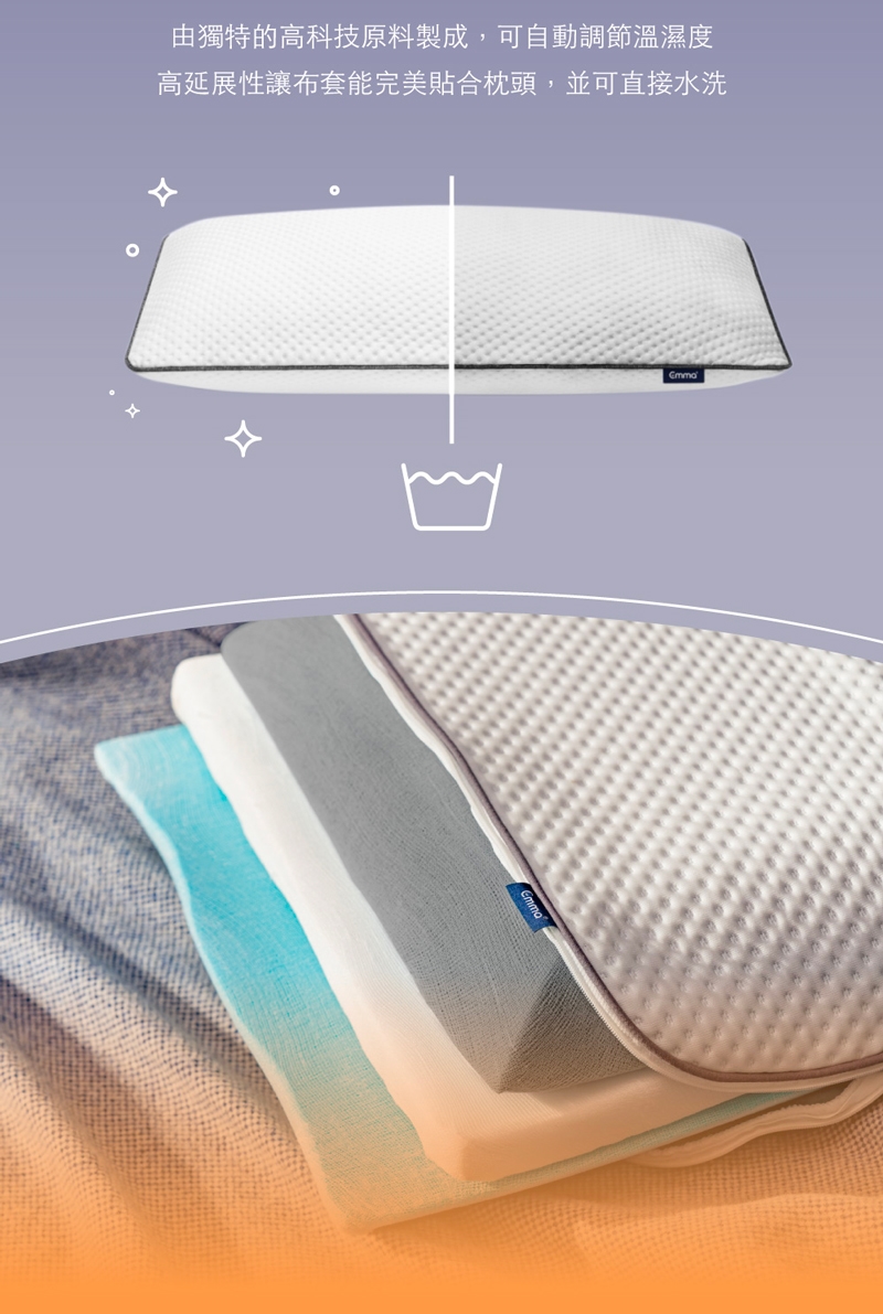 Emma記憶枕使用最耐用的記憶棉層製成,長時間維持良好狀態。Emma枕頭布套可以放心拆下放入洗衣機清洗,輕鬆容易!