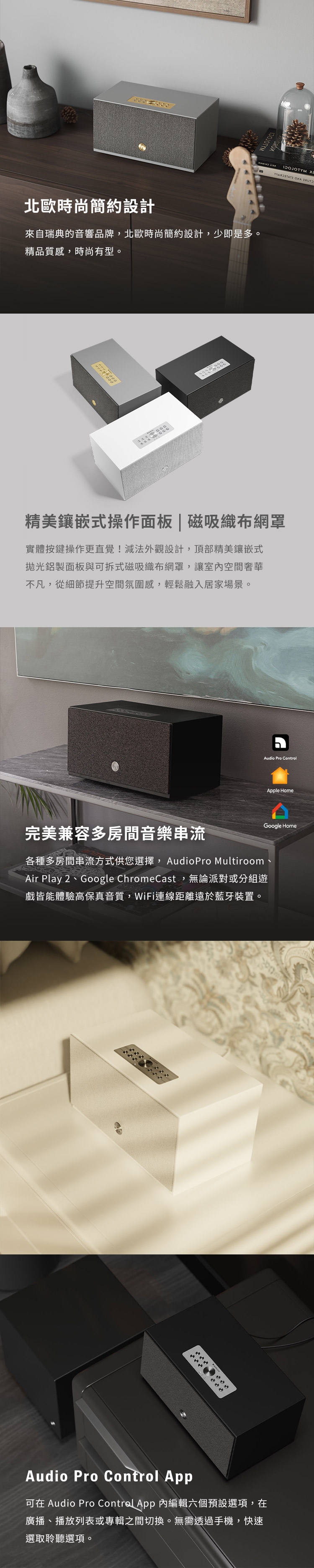 - 完美兼容|兼容 Apple Home 、Google Home、Audio Pro Control