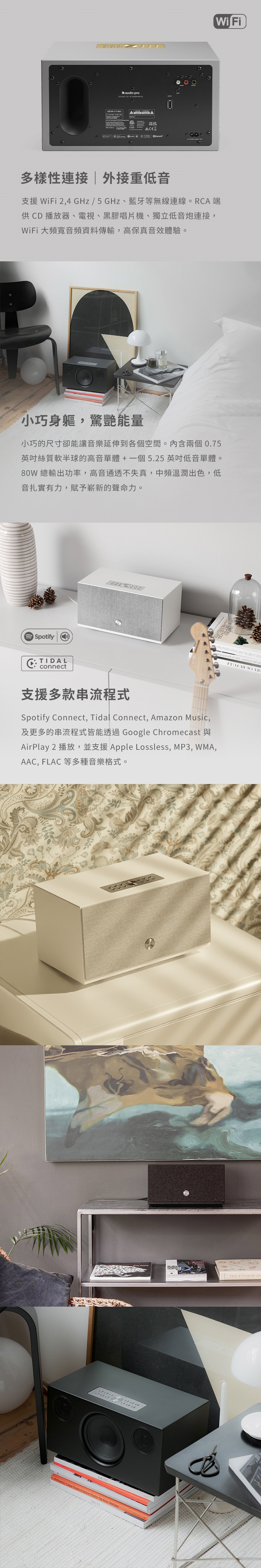 音源播放:WiFi 2,4 GHz、WiFi 5 GHz、RCA in、藍牙