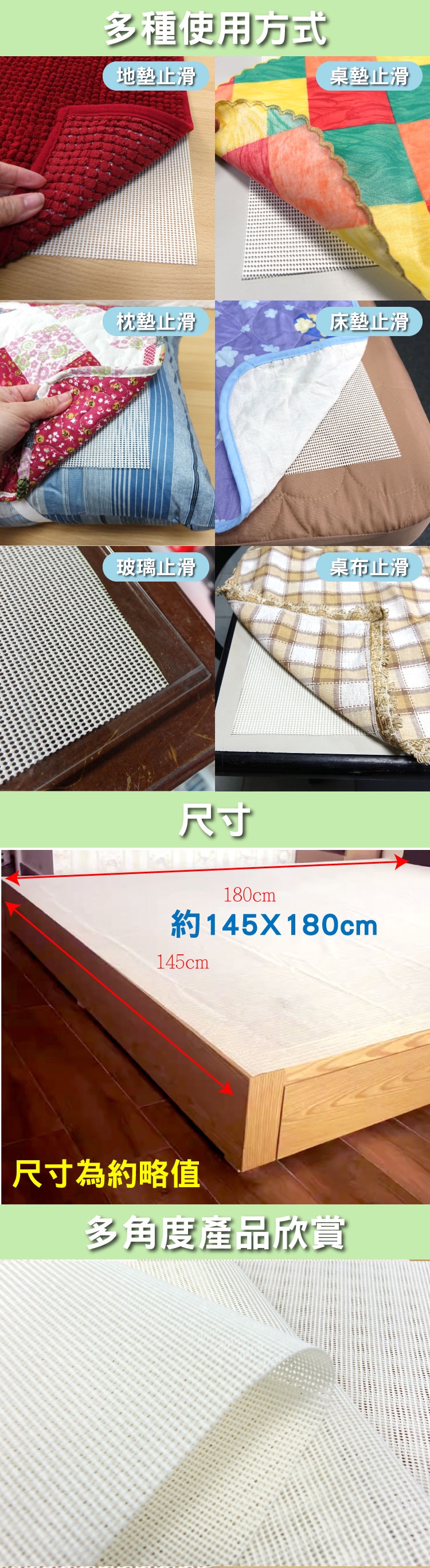 直接鋪墊於需止滑材質下方即可,如玻璃、床墊、枕店、地墊、桌巾、桌墊、地毯、床墊下等。