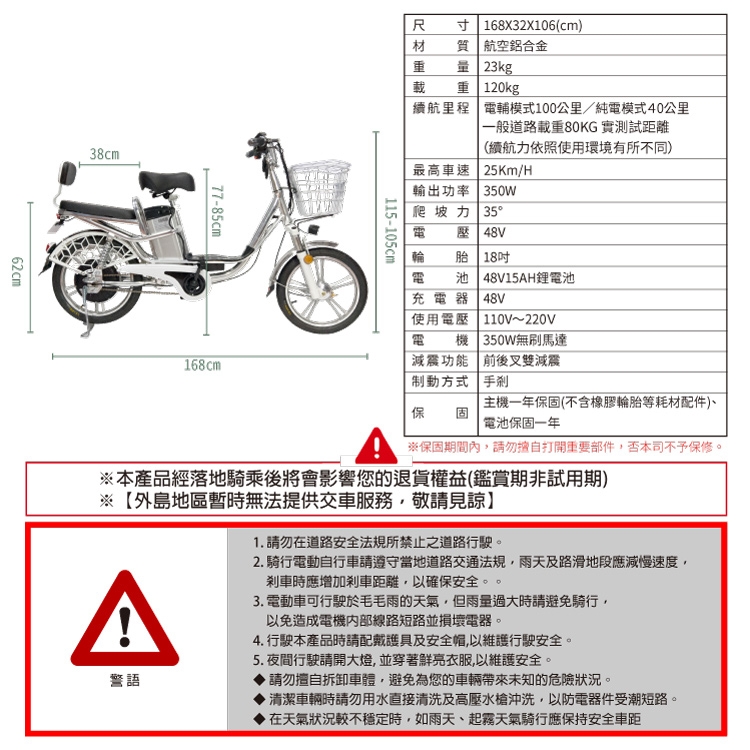 ※本商品非人為因素,自購買日起主機保固1年(不含橡膠輪胎等耗材配件)、電池保固1年