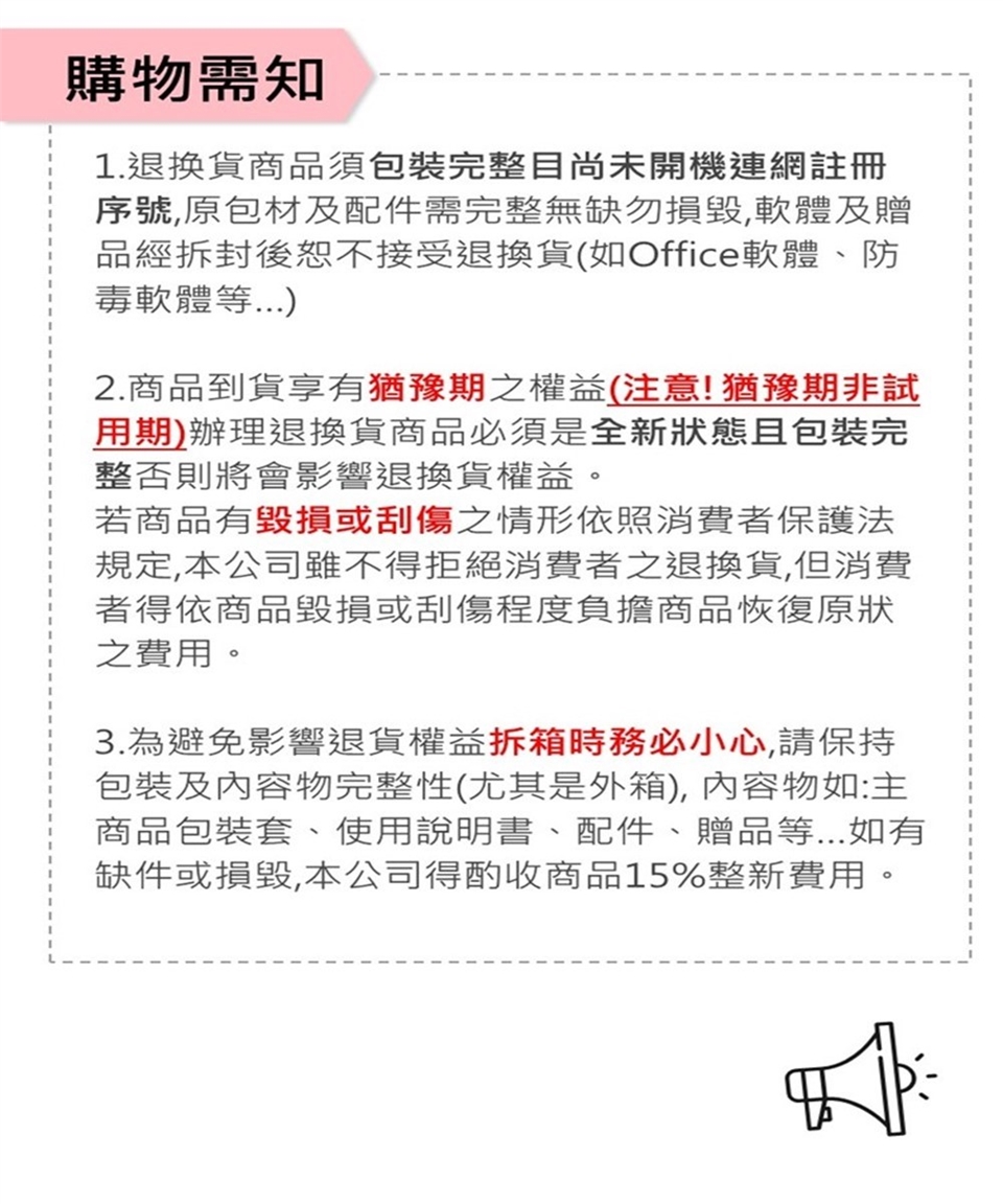 注意事項/退/換貨商品須保持商品本身外觀、包裝及配件完整;軟體及贈品經拆封後不接受退貨。/鑑賞期並非試用期,商品若有人為使用的刮傷或包裝損毀,皆須負擔整新費用(依程度收取回復原狀之費用)消費者於商品到貨十日猶豫期(非適用期)期間內因檢查之必要而置商品有毀損或刮傷之情形,依照消費者保護法規定,本公司雖不得拒絕消費者之退換貨,但消費者得依商品毀損或刮傷程度負擔商品恢復原狀之費用。 商品規格可能會依照國家地區而有所變動,皆以原廠公佈為準。 商品顏色可能會因拍照光線誤差或螢幕設定而與實際產品有所差異。我們會盡力提共正確與完整的資料於網頁上,並保留更動、修正頁面資訊的權利,恕不另行通知。贈品數量有限。若已送完,我們將保留贈送其他等值贈品之權利。