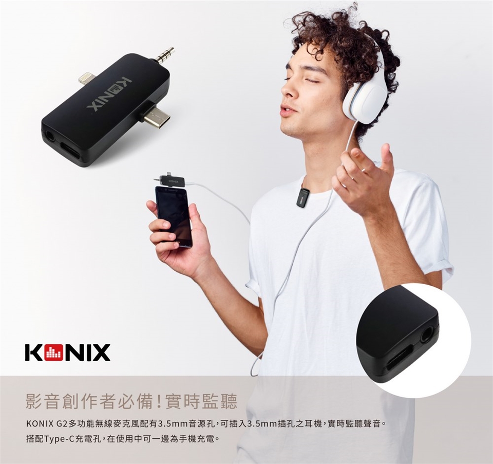 KONIX G2 多功能無線收音麥克風配有3.5mm音源孔,可插入3.5插孔之耳機,實時間聽聲音。搭配Type-C充電孔,在使用中可一邊為手機充電。