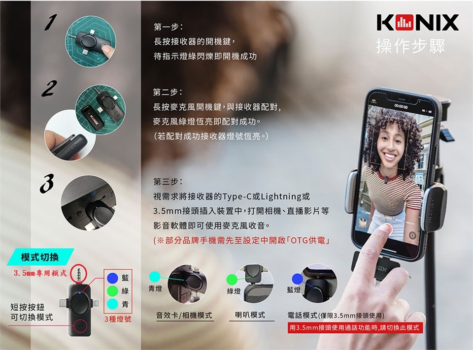 KONIX G2 多功能無線麥克風 Lightning、Type-C、3.5mm 三合一設計 一機多用