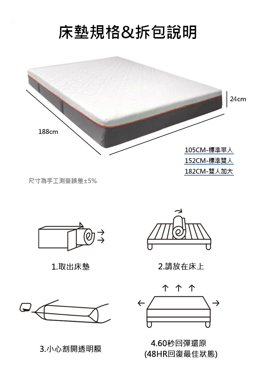 2.床墊開箱後約需要「15-30天內」回彈到最佳躺感,在這期間床墊有稍軟或折痕皆屬正常現象,可正常使用,無須擔心會影響回彈狀態。